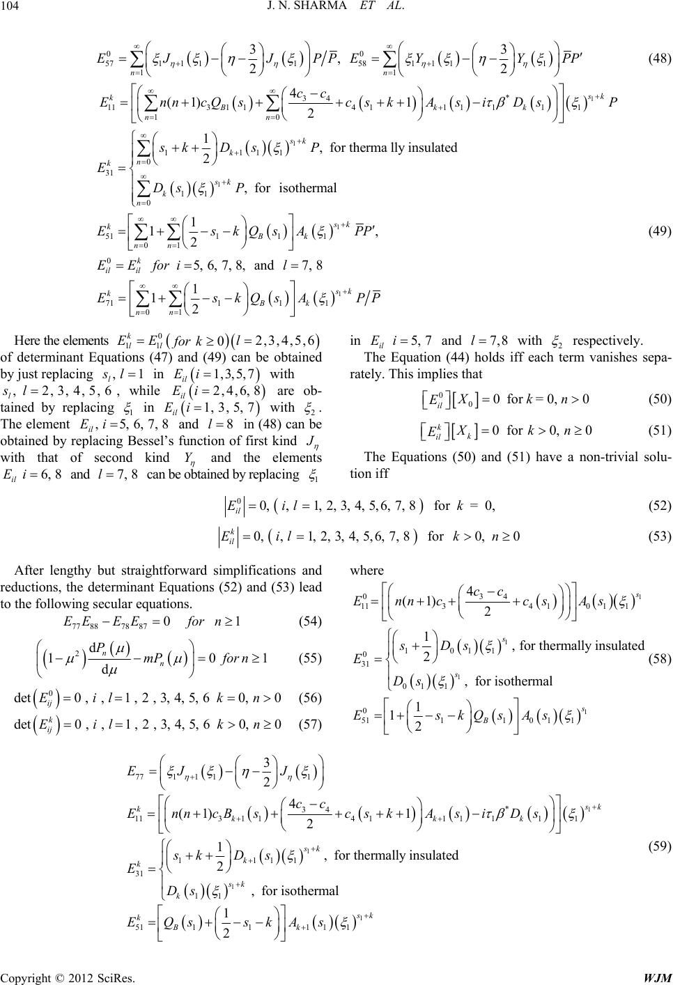 J. N. SHARMA ET AL. 104 00 571111581111 11 33 , 22 nn EJJPPEY Y PP (48) 1 1 1 * 34 1131 1411 1111 10 1111 0 31 11 0 51 0 4 (1) 1 2 1,for therma lly insulated 2 ,for isothermal 1 12 sk k Bk nn sk k n k sk k n k n cc EnncQs cskAsiDs skD sP E Ds P E k P 1 1 111 1 0 7111 1 01 , 5,6,7, 8,and7, 8 1 12 sk Bk n k il il sk k Bk nn skQs APP EEfori l EskQsAPP (49) Here the elements 0 11 2,3,4,5,6 0 k ll EE l for k ,1 of determinant Equations (47) and (49) can be obtained by just replacing l l 1,3,5,7 il Ei 2,4,6, 8 il Ei 1 in with l, while are ob- tained by replacing , 2,3,4,5sl,6 in with 2 1, 3, 5, 7 il Ei . The element il and in (48) can be obtained by replacing Bessel’s function of first kind ,Ei5,6,7,88l with that of second kind Y and the elements and l can be obtained by replacing 6, 8 il Ei7, 81 in 5,7 il Ei and 7,8l with 2 respectively. The Equation (44) holds iff each term vanishes sepa- rately. This implies that 0 00for =0, 0 il Xkn E (50) 0 for0,0 k k il Xkn E (51) The Equations (50) and (51) have a non-trivial solu- tion iff 00, ,1,2,3,4,5,6,7,8 il Eil for k = 0, (52) 0,,1,2,3,4,5,6,7,8 k il Eil for (53) 0,0kn After lengthy but straightforward simplifications and reductions, the determinant Equations (52) and (53) lead to the following secular equations. 77 8878870EE EEforn 1 (54) 2d 10 d n n PmPfor n 1 where (55) 0 det0,,1,2 ,3,4, 5, 60,0 ij Eil kn (56) det0,,1,2, 3, 4, 5, 60,0 k ij Eilkn (57) 1 1 1 1 034 113410 11 1011 0 31 011 0 51110 11 4 (1) 2 1,for thermally insulated 2 ,for isothermal 1 12 s s s B cc Ennc csAs sDs E Ds EskQsAs (58) 1 1 1 771111 * 34 1131 14 11 1111 1111 31 11 51 3 2 4 (1) 1 2 1,for thermally insulated 2 ,for isothermal k k kk sk k k sk k k B EJJ cc EnncBs cskAsiDs skD s E Ds EQ k 1 11 111 1 2 sk k sskAs (59) Copyright © 2012 SciRes. WJM