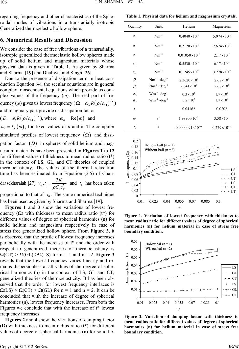 J. N. SHARMA ET AL. 106 regardin cy ag frequennd other characteristics of the Sphe- roidal modes of vibrations in a transradially isotropic Generalized thermoelastic hollow sphere. 6. Numerical Results and Discussion We consider the case of free vibrations of a transradially, isotropic generalized thermoelastic hollow spheres made up of solid helium and magnesium materials whose physical data is given in Table 1. As given by Sh and Dhaliwal and Sin general plex transcens co plex values of the fre quency (ω) giv frequency arma d Sharma [19] angh [26]. Due to the presence of dissipation term in heat con- duction Equation (4), the secular equations are in comdental equations which provide um- quency (ω). The real part of fre- es us lowest( 1/2 44RRc ) and imaginary part provide us dissipation factor ( 1/2 44I DRc ), where Re R and Im I , for fixed values of n and k. The computer simulated profiles of lowest frequency and dissi- presented res 1 to 1 pation factor D in spheres of solid helium and mag- nesium materials have beenin Figu 2 for different values of thickness to mean radius ratio (t*) in the context of LS, GL, and CT theories of coupled thermoelasticity. The values of the thermal relaxation time has been estimated from Equation (2.5) of Chan- drasekharaiah [27] 02 44 3 . iz e vt Cc and 1 t has been taken proportional to that of . The sameerical technique 19]. es linearly and re of sphe nd CT, neralized theorieoelasticity. It has been ob- served that Ω(LS) > Ω(C ee low Heliu 0 has been used as given by Sharma and Sharma [ t num Figures 1 and 3 show the variations of lowest fre- quency (Ω) with thickness to mean radius ratio (t*) for different values of degree of spherical harmonics (n) for solid helium and magnesium respectively in case of stress free generalized hollow sphere. From Figure 3, it is observed that the profile of lowest frequency increases parabolically with the increase of t* and the order with respect to generalized theories of thermoelasticity is Ω(CT) > Ω(GL) >Ω(LS) for n = 1 and n = 2. Figure 3 reveals that the lowest frequency vari- mains dispersionless at all values of the degree- rical harmonics (n) in the context of LS, GL a ges of therm the order for lowest frequency interlaces is T) > Ω(GL) for n = 1 and n = 2. It can be concluded that with the increase of degrof spherical harmonics (n),est frequency increases. From both the Figures we conclude that with the increase of t* lowest frequency increases. Figures 2 and 4 show the variations of damping factor (D) with thickness to mean radius ratio (t*) for different values of degree of spherical harmonics (n) for solid he- Table 1. Physical data for helium and magnesium crystals. QuantityUnitsm Magnesium 11 c 2 Nm 10 0.404010 10 5.974 10 12 c 2 Nm 10 0.212010 10 2.624 10 13 c 2 Nm 10 0.0105010 10 2.17 10 33 c 2 Nm 10 0.553010 10 6.17 10 44 c 2 Nm 10 0.1245 10 10 3.278 10 1 3 21 Nm deg 21 Nm deg 6 2.3620 10 6 2.641 10 6 2.68 10 6 2.68 10 1 3 11 Wm deg 11 Wm deg 2 0.3 10 1 0.2 10 2 1.7 10 2 1.7 10 0.04162 0.0202 -1 s 13 1.9890 10 11 3.58 10 0 t s 13 0.0000091 10 11 0.27910 0 0.02 0.04 01 0.0250.055 0.07 85 0.1 t* 0.06 0.08 0.1 0.12 0.14 0.16 0.18 0.2 0. 0.040.0 LS GL CT LS GL CT Hollow ball (n = 1) Without ball (n =2) cy (Ω) Lowest equen Figure 1. Variation of lowest frequencwith thickness to mean radius ratio for different values of degree of spherical harmoics (n) for lium material ine of stress free boundary condition. y nhe cas 0 0.01 0.02 0.03 0.04 0.05 0.06 0.07 0.01 0.0250.04 0.055 0.070.0850.1 t* Damping factoer (D LS GL CT LS GL CT Hollow ball (n = 1) Without ball (n =2) Figure 2. Variation of damping factor with thickness to mean radius ratio for different values of degree of spherical harmonics (n) for helium material in case of stress free boundary condition. Copyright © 2012 SciRes. WJM