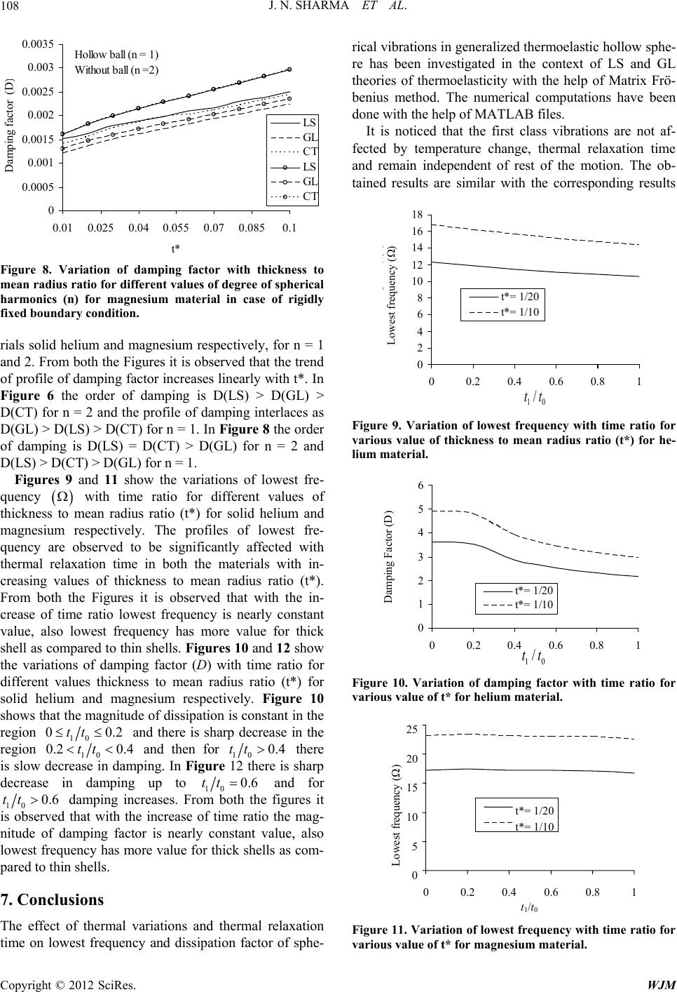 J. N. SHARMA ET AL. 107 0 0.05 0.1 0.15 0.2 0.25 0.01 0.025 0.04 0.055 0.070.0850.1 t* Lowest equency ( ) LS GL CT LS GL CT Hollow ball (n = 1) Without ball (n =2) Lowest equency (Ω) Figure 3. Variation of lowest frequency with thickness to mean radius ratio for different values of degree of spherical harmonics (n) for magnesium material in case of stress free boundary condition. 0 0.01 0.02 0.03 0.04 0.05 0.06 0.07 0.08 0.010.0250.040.055 0.07 0.0850.1 t* Damping factor (D) LS GL CT LS GL CT Hollow ball (n = 1) Without ball (n =2) Figure 4. Variation of damping factor with thickness to mean radius ratio for different values of degree of spherica m crystals respectively in case of stress free boundary condition. From Figures 2 and 4 it is observed that the trend of profile of damping increases linearly with t* and the order is l harmonics (n) for magnesium material in case of stress free boundary condition. lium and magnesiu DLSDGLDCT L DCT for n = 2 re- for n = 1 and spectively. An examination is made on the variations of dimen- sionless lowest frequency with respect to thickness to mean radius ratio (t*) ranging from thin spherical shell (t* = 0.05) to the thick spherical shell (t* = 0.1) of iso- tropic materials. The findings confirm that the variation of the Spheroidal frequencies increases with t* and for degree of spherical harmonics (n), the same trend of pro ickness to mean radius ratio (t*) for ifferent values of degree of spherical harmonics (n) for two materials solid helium and magnesium respectively in case of rigidly fixed boundary condition. For both the materials similar behaviour has been observed i.e. the lowest frequency increases with the increase of t*. In DLS DG - file for damping has been observed i.e. damping in- creases with the increase of t*. Figures 5 and 7 show the variations of lowest fre- uency () with thq d 0 0.005 0.01 0.015 0.02 0.025 0.01 0.025 0.04 0.0550.07 0.0850.1 t* Lowest frequency ( ) LS GL CT LS GL CT Hollow ball (n = 1) Without ball (n =2) Lowest frequency (Ω) Figure 5. Variation of lowest frequency with thickness to mean radius ratio for different values of degree of spherical harmonics (n) for helium material in case of rigidly fixed oundary condition. b 0 0.01 0.02 0.01 0.025 0.04 0.0550.07 0.0850.1 t* 0.03 0. Damping fa 04 0.05 0.06 0.07 ctor (D) LS GL CT LS GL CT Hollow ball (n = 1) Without ball (n =2) Figure 6. Variation of damping factor with thickness to mean radius ratio for different values of degree of spherical harmonics (n) for helium material in case of rigidly fixed boundary condition. 0 0.001 0.002 0.003 0.004 0.005 0.006 0.007 0.008 0.009 west frequency ( 0.01 0.0250.04 0.055 0.070.0850.1 t* Lo ) LS GL CT LS GL CT Hollow ball (n = 1) Without ball (n =2) west frequency (Ω) Lo Figure 7. Variation of lowest frequency with thickness to mean radius ratio for different values of degree of spherical harmonics (n) for magnesium material in case of rigidly fixed boundary condition. Figure 5 the trend of profiles of lowest frequency inter laces is - CTGL CT for n = 1 and n = 2. In Figure 7 the profile of lowest frequency interlaces is CTLS GL in context of linear theories of generalized thermoelasticity. Figures 6 and 8 show the variations of damping factor D) with degree of spherical harmonics (n) for two mate- ( Copyright © 2012 SciRes. WJM