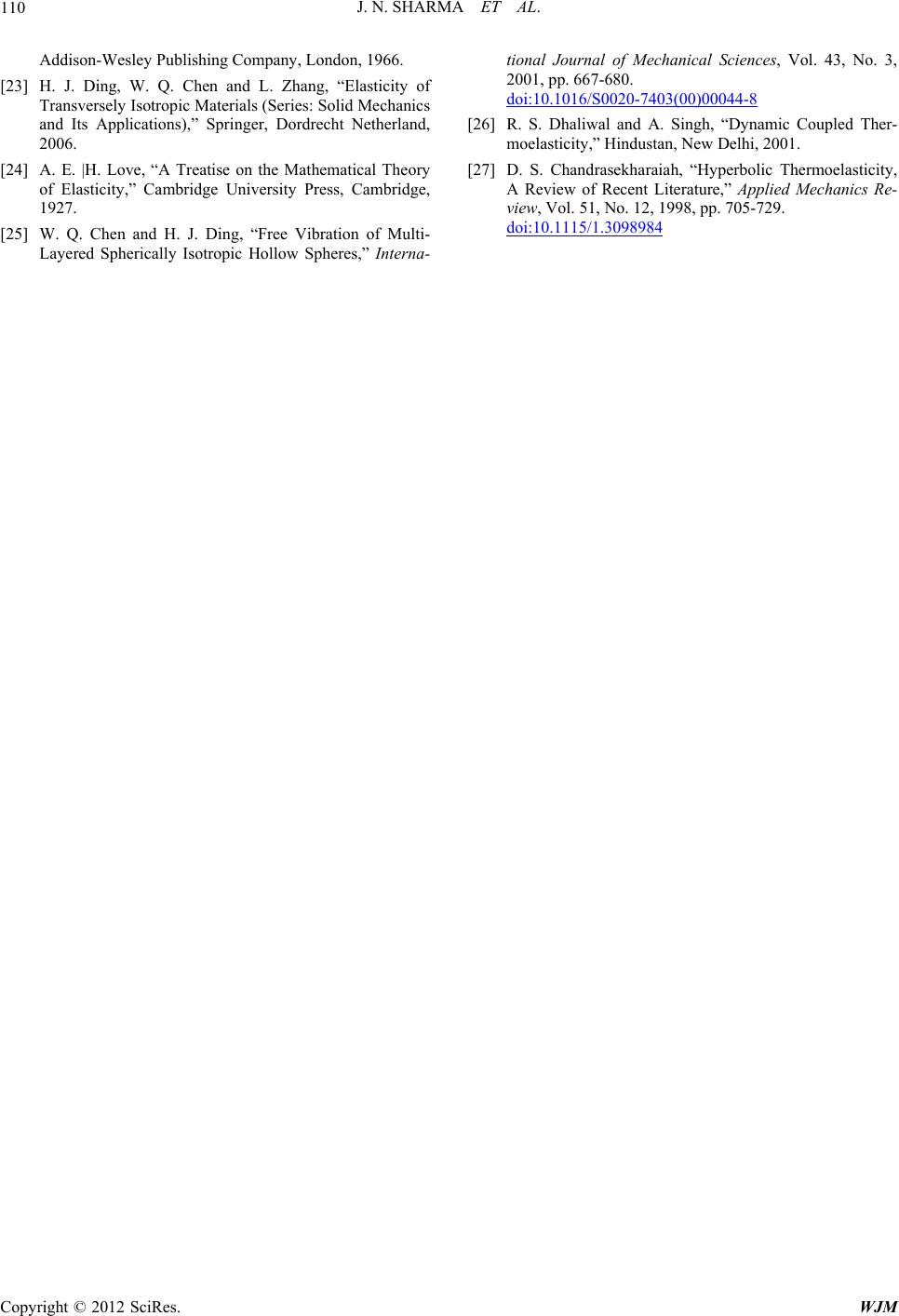 J. N. SHARMA ET AL. Copyright © 2012 SciRes. WJM 110 hing Company, London, 1966. tion of Multi- Spheres,” Interna- pp. 667-680. Addison-Wesley Publis [23] H. J. Ding, W. Q. Chen and L. Zhang, “Elasticity of Transversely Isotropic Materials (Series: Solid Mechanics and Its Applications),” Springer, Dordrecht Netherland, 2006. [24] A. E. |H. Love, “A Treatise on the Mathematical Theory of Elasticity,” Cambridge University Press, Cambridge, 1927. [25] W. Q. Chen and H. J. Ding, “Free Vibra Layered Spherically Isotropic Hollow tional Journal of Mechanical Sciences, Vol. 43, No. 3, 2001, doi:10.1016/S0020-7403(00)00044-8 [26] R. S. Dhaliwal and A. Singh, “Dynamic Coupled Ther- moelasticity,” Hindustan, New Delhi, 2001. [27] D. S. Chandrasekharaiah, “Hyperbolic A Review of Recent Literature,” A Thermoelasticity, pplied Mechanics Re- view, Vol. 51, No. 12, 1998, pp. 705-729. doi:10.1115/1.3098984