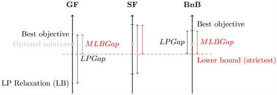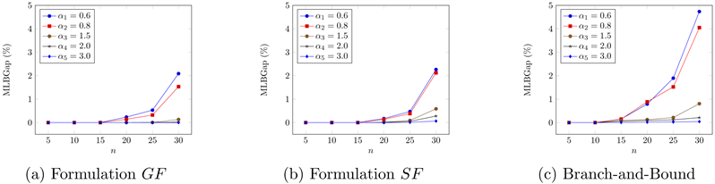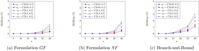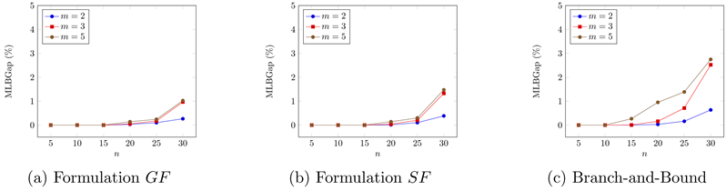 The quality of the solution found by each method/formulation can be evaluated by the gap of the best-known lower bound (MLBGap) to the actual solution. This gap can be considered as the maximum possible gap to the optimal solution.