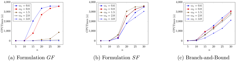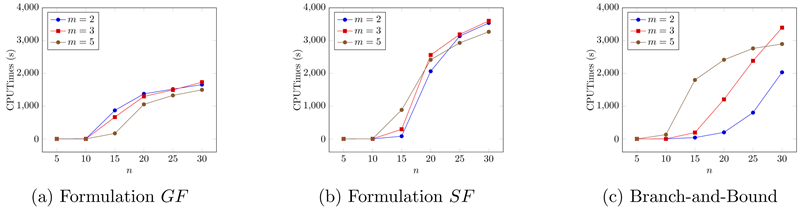 Figure 3 plots the average CPUTimes of each value of m in function of n numbers of jobs. The solving time three solving methods discriminate when the number of jobs is greater than or equal to 15. While the CPUTimes of CPLEX for GF formulation increase in a stable way, the solving time of the other two methods increases in an exponential fashion.