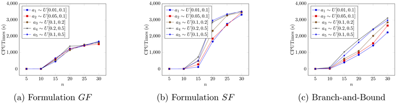 From the data of Table 4, one can see the non-negligent impact of the distribution of the release times of jobs to the solving times. For the two sparsest arrival rate ( and ), GF has outstanding solving time. Figure 4 plots the average CPUTimes of each scale factor in function of n numbers of jobs. Data from this figure show us that the solving time of GF formulation seems to be independent of the problem size when the release dates are sparse. On the contrary,GF formulation is very sensible to the dense release time when the resolution time of CPLEX for this formulation worsens exponentially. BnB algorithm is also sensitive to this factor: the computational times are reduced by half when goes from 0.6 to 3.0. The computational time increase with in and decreases with in . The global trend for all solving methods is that it takes a shorter time to solve an instance with a sparse release date.