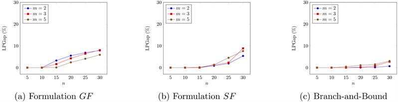 Figure 6 details the impact of the number of machines to the average LPGap of each method in the function of n jobs. The LPGap curve of the Branch-and-Bound increases in a very stable way when the number of jobs rises up when the number of machines is small ( ) the LPGap of the BnB algorithm nearly zero regardless of the number of jobs.