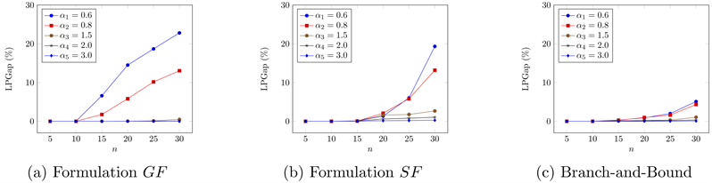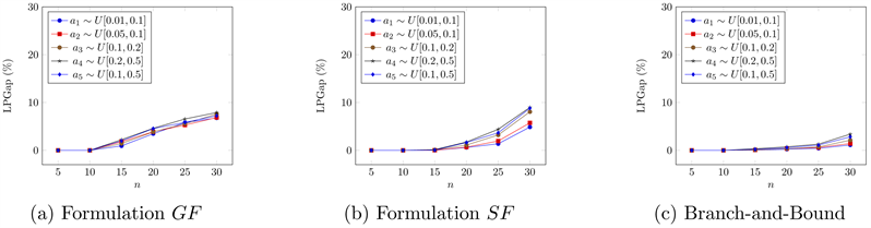 Table 6 presents the average LPGaps of each solving methods in function of the arrival density scale parameter . One can observe an important impact of to the quality of the solution found all three methods, especially the solving of formulation GF. The critical value of is 1.5, the LPGaps deteriorates when .