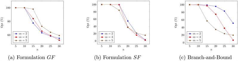 Table 4 shows the results of average computational times of each method according to the variation of machines numbers m. Adding the more machine takes the Branch-and-Bound (BnB) largely more time to solve: when the number of machines goes from 2 to 5 the average CPUTimes increase nearly seven times. The solving time of the SF formulation increases also with the number of machines, but more slowly in comparison to the Branch-and-Bound algorithm. In the contrary, adding more machines reduces the solving times of the graph-based MILP by 32%.