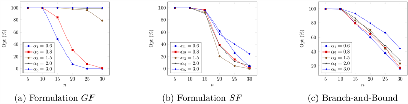Cross-Table 10 presents the percentage of instances being solved to optimality corresponding to each pair of the release date density and the setup time length scale. CPLEX solves the instance easily to optimal by GF formulation when α is greater than or equal to 1.5, regardless of the value of setup-times. For the Branch-and-Bound algorithm, both values of α and a harm the number of instances being solved to optimality. The relation between the number of instance solved and the structure α and a is more random when CPLEX solves instances by SF formulation. When we combined all methods, the number of optimal solutions increase with α and decrease with a.