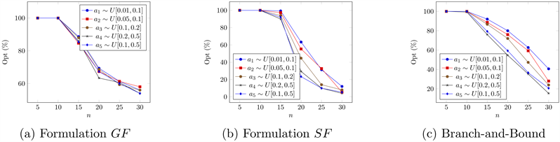 Figure 14. The percentage of instances solved to optimality according to setup time scale factor a and number of jobs n.