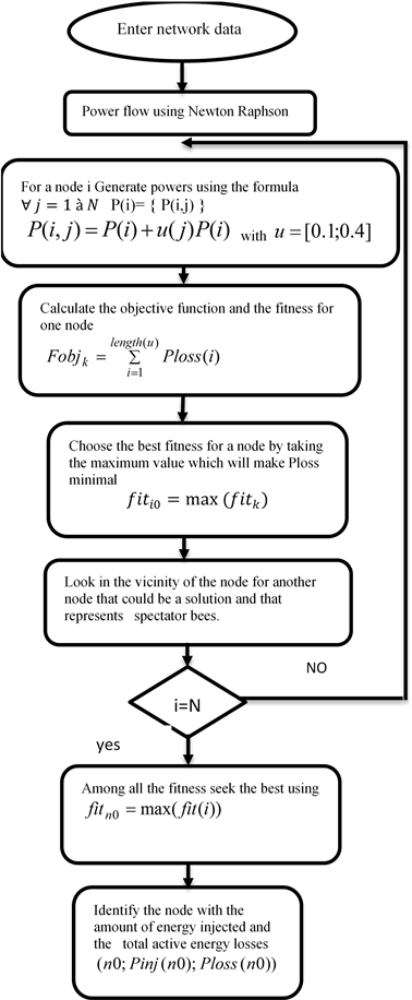 At each node, the energy injected varies between 1% and 40% of the source’s generator power. The number of energy injected is 10, which represents the number of worker bees. At each injection, the program calculates the total grid losses and takes the minimum value of the active grid losses and the injected power that made it possible to obtain the latter. This minimum value is the local minimum. Having the local minimum of all the nodes, we will look for the global minimum corresponding to the whole network