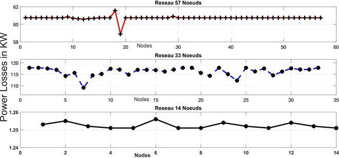 The written program has been tested on IEEE 14, 33, 57 nodes networks. The data are obtained from [22]. Active energy losses per network and per node (Figure 3) show the losses at the different nodes and for the three types. It is important to know how our program evolves with the network.