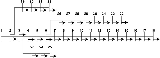 According to these curves of Figure 4, the node voltage moduli remain between the minimum (0.9 pu) and maximum (1.1 pu) values in the range [0.98; 1.1] pu. In order to make a comparison with the results in the literature, we used data from the work of [9]. An example of a 33-node IEEE network is shown in Figure 5.