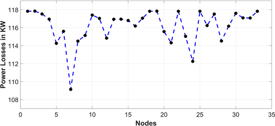 In this Figure 6, it can be seen that the losses are minimal at node 7 with a value of 109.1 KW. This is the global optimum. Table 1 below compares the