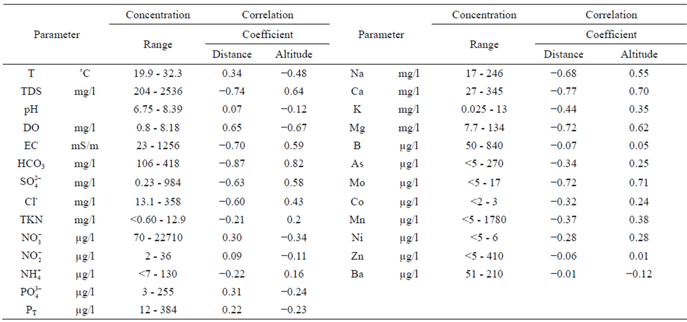 Table 1. Detectable concentrations of groundwater quality parameters and their correlation coefficient in relation to altitude and distance of mining activities.