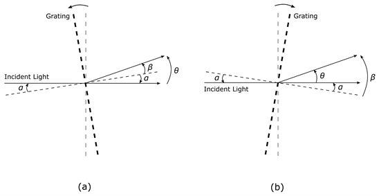 Figure 2. A diagram showing the angle of deviation between a diffracted ray of light and the incident ray. The diffraction grating is rotated (a) counterclockwise ( ) and (b) clockwise ( ) relative to normal incidence.