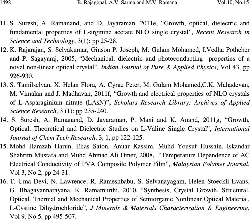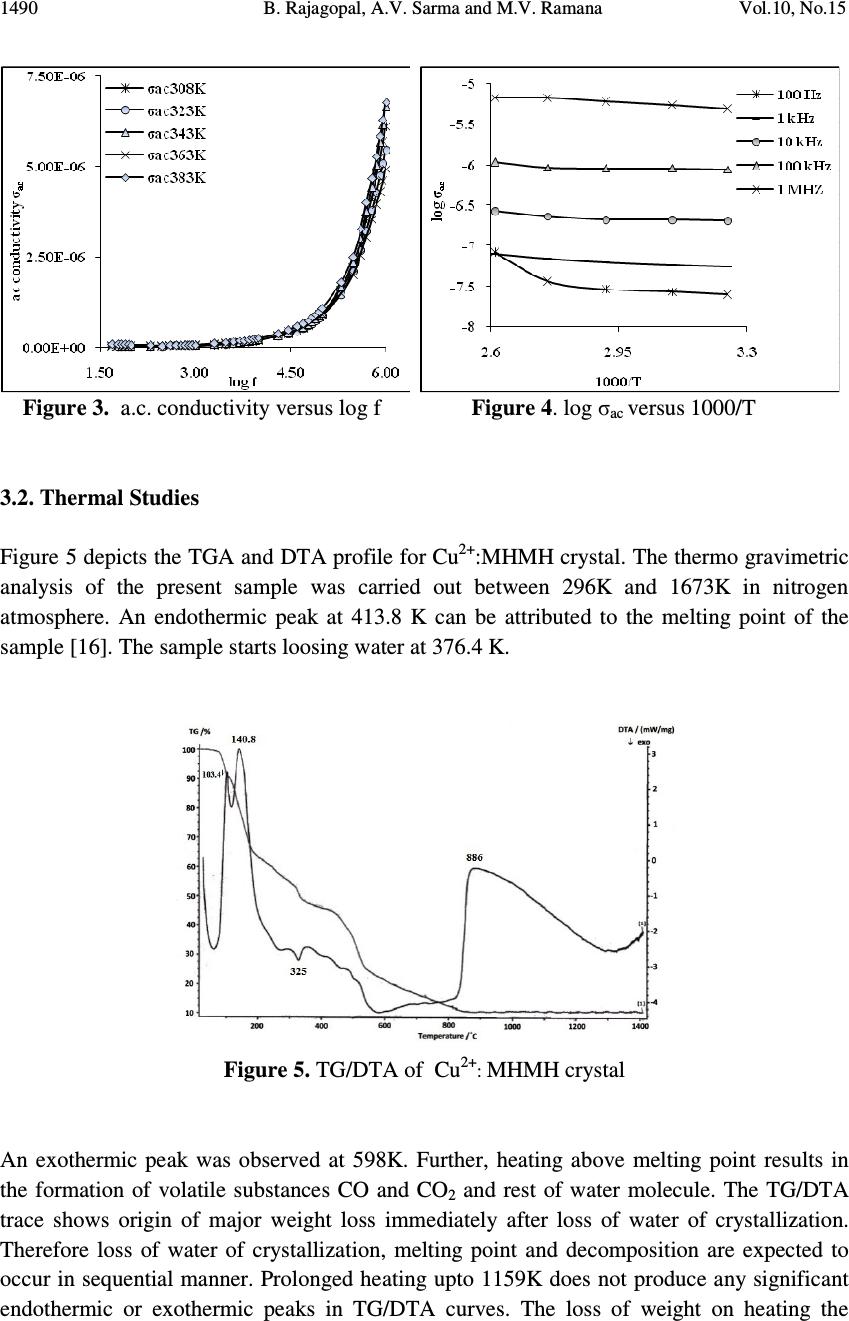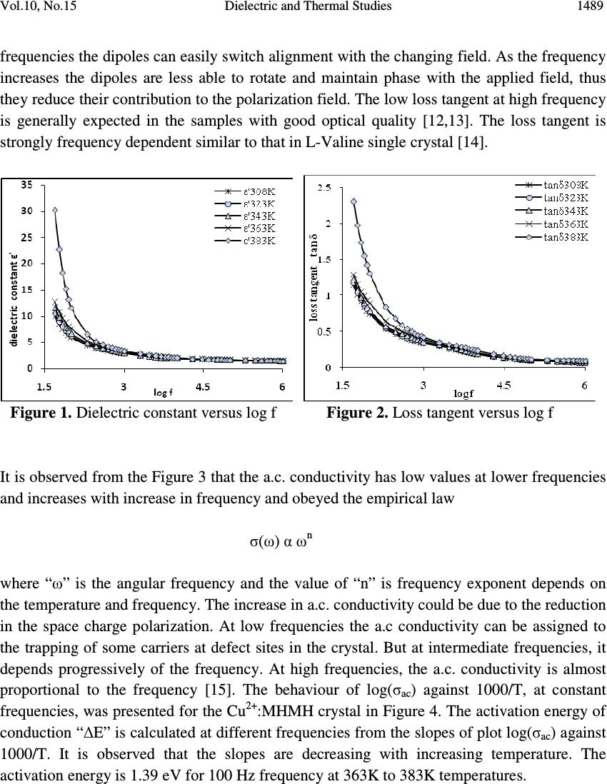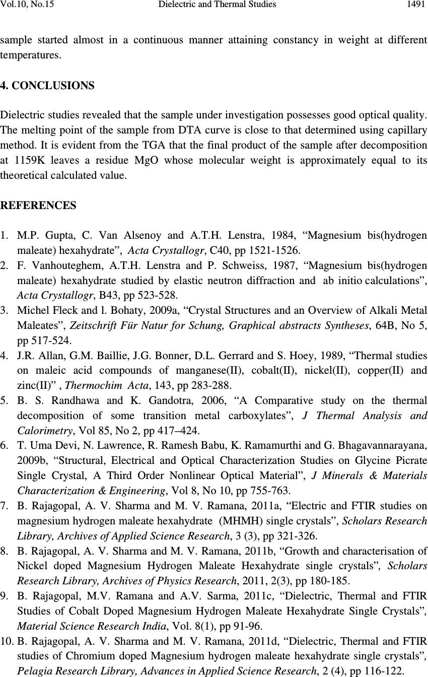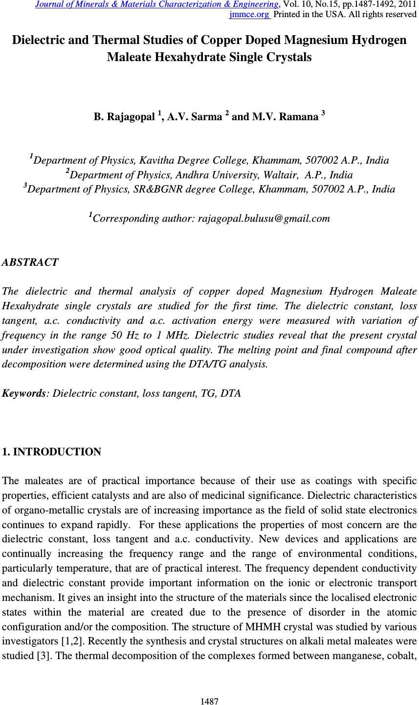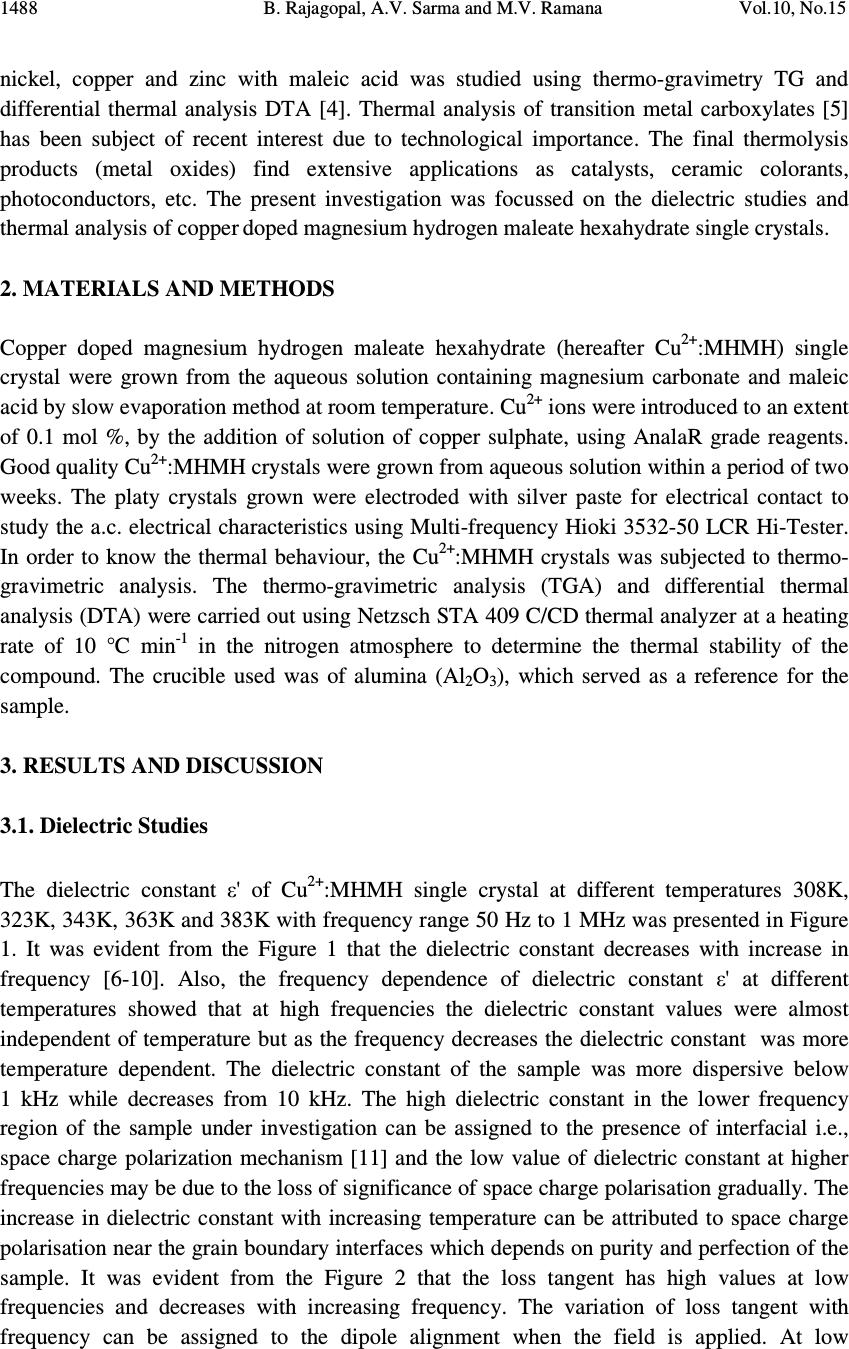 ![]() Journal of Minerals & Materials Characterization & Engineering, Vol. 10, No.15, pp.1487-1492, 2011 jmmce.org Printed in the USA. All rights reserved 1487 Dielectric and Thermal Studies of Copper Doped Magnesium Hydrogen Maleate Hexahydrate Single Crystals B. Rajagopal 1 , A.V. Sarma 2 and M.V. Ramana 3 1 Department of Physics, Kavitha Degree College, Khammam, 507002 A.P., India 2 Department of Physics, Andhra University, Waltair, A.P., India 3 Department of Physics, SR&BGNR degree College, Khammam, 507002 A.P., India 1 Corresponding author: rajagopal.bulusu@gmail.com ABSTRACT The dielectric and thermal analysis of copper doped Magnesium Hydrogen Maleate Hexahydrate single crystals are studied for the first time. The dielectric constant, loss tangent, a.c. conductivity and a.c. activation energy were measured with variation of frequency in the range 50 Hz to 1 MHz. Dielectric studies reveal that the present crystal under investigation show good optical quality. The melting point and final compound after decomposition were determined using the DTA/TG analysis. Keywords: Dielectric constant, loss tangent, TG, DTA 1. INTRODUCTION The maleates are of practical importance because of their use as coatings with specific properties, efficient catalysts and are also of medicinal significance. Dielectric characteristics of organo-metallic crystals are of increasing importance as the field of solid state electronics continues to expand rapidly. For these applications the properties of most concern are the dielectric constant, loss tangent and a.c. conductivity. New devices and applications are continually increasing the frequency range and the range of environmental conditions, particularly temperature, that are of practical interest. The frequency dependent conductivity and dielectric constant provide important information on the ionic or electronic transport mechanism. It gives an insight into the structure of the materials since the localised electronic states within the material are created due to the presence of disorder in the atomic configuration and/or the composition. The structure of MHMH crystal was studied by various investigators [1,2]. Recently the synthesis and crystal structures on alkali metal maleates were studied [3]. The thermal decomposition of the complexes formed between manganese, cobalt, ![]() 1488 B. Rajagopal, A.V. Sarma and M.V. Ramana Vol.10, No.15 nickel, copper and zinc with maleic acid was studied using thermo-gravimetry TG and differential thermal analysis DTA [4]. Thermal analysis of transition metal carboxylates [5] has been subject of recent interest due to technological importance. The final thermolysis products (metal oxides) find extensive applications as catalysts, ceramic colorants, photoconductors, etc. The present investigation was focussed on the dielectric studies and thermal analysis of copper doped magnesium hydrogen maleate hexahydrate single crystals. 2. MATERIALS AND METHODS Copper doped magnesium hydrogen maleate hexahydrate (hereafter Cu 2+ :MHMH) single crystal were grown from the aqueous solution containing magnesium carbonate and maleic acid by slow evaporation method at room temperature. Cu 2+ ions were introduced to an extent of 0.1 mol %, by the addition of solution of copper sulphate, using AnalaR grade reagents. Good quality Cu 2+ :MHMH crystals were grown from aqueous solution within a period of two weeks. The platy crystals grown were electroded with silver paste for electrical contact to study the a.c. electrical characteristics using Multi-frequency Hioki 3532-50 LCR Hi-Tester. In order to know the thermal behaviour, the Cu 2+ :MHMH crystals was subjected to thermo- gravimetric analysis. The thermo-gravimetric analysis (TGA) and differential thermal analysis (DTA) were carried out using Netzsch STA 409 C/CD thermal analyzer at a heating rate of 10 °C min -1 in the nitrogen atmosphere to determine the thermal stability of the compound. The crucible used was of alumina (Al 2 O 3 ), which served as a reference for the sample. 3. RESULTS AND DISCUSSION 3.1. Dielectric Studies The dielectric constant ε' of Cu 2+ :MHMH single crystal at different temperatures 308K, 323K, 343K, 363K and 383K with frequency range 50 Hz to 1 MHz was presented in Figure 1. It was evident from the Figure 1 that the dielectric constant decreases with increase in frequency [6-10]. Also, the frequency dependence of dielectric constant ε' at different temperatures showed that at high frequencies the dielectric constant values were almost independent of temperature but as the frequency decreases the dielectric constant was more temperature dependent. The dielectric constant of the sample was more dispersive below 1 kHz while decreases from 10 kHz. The high dielectric constant in the lower frequency region of the sample under investigation can be assigned to the presence of interfacial i.e., space charge polarization mechanism [11] and the low value of dielectric constant at higher frequencies may be due to the loss of significance of space charge polarisation gradually. The increase in dielectric constant with increasing temperature can be attributed to space charge polarisation near the grain boundary interfaces which depends on purity and perfection of the sample. It was evident from the Figure 2 that the loss tangent has high values at low frequencies and decreases with increasing frequency. The variation of loss tangent with frequency can be assigned to the dipole alignment when the field is applied. At low ![]() Vol.10, No.15 Dielectric and Thermal Studies 1489 frequencies the dipoles can easily switch alignment with the changing field. As the frequency increases the dipoles are less able to rotate and maintain phase with the applied field, thus they reduce their contribution to the polarization field. The low loss tangent at high frequency is generally expected in the samples with good optical quality [12,13]. The loss tangent is strongly frequency depen
