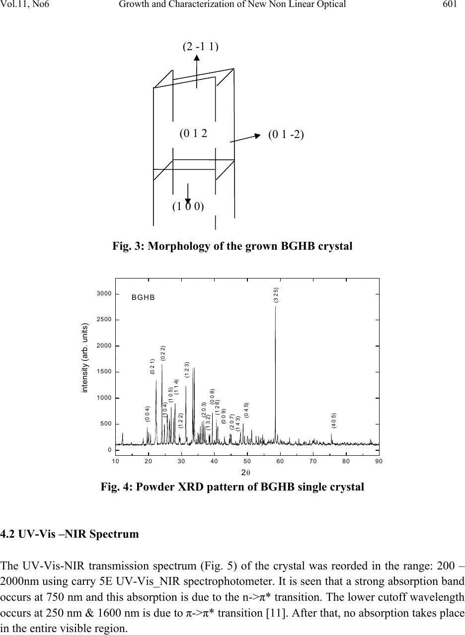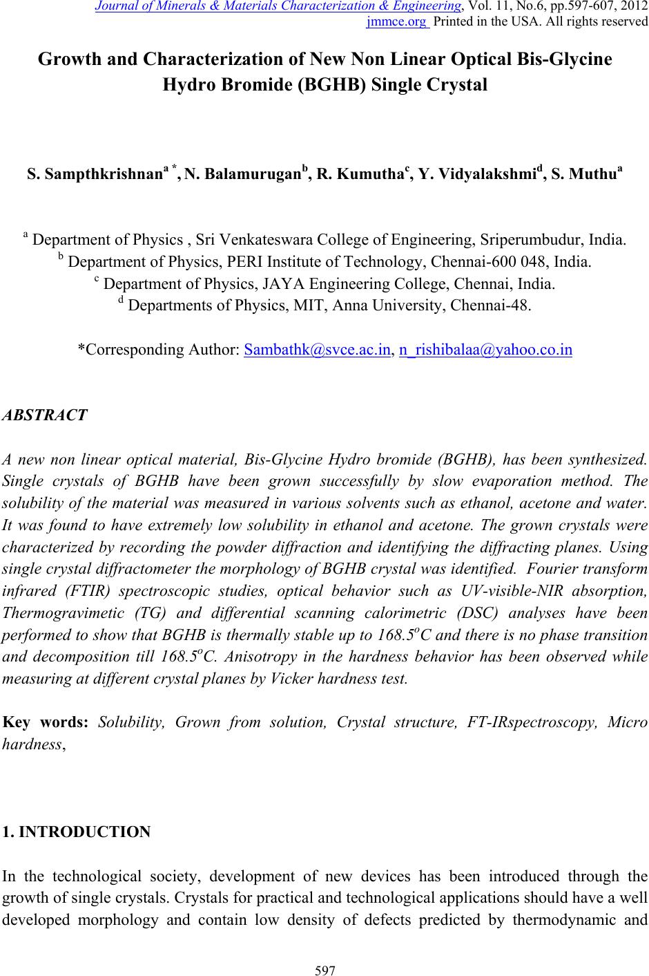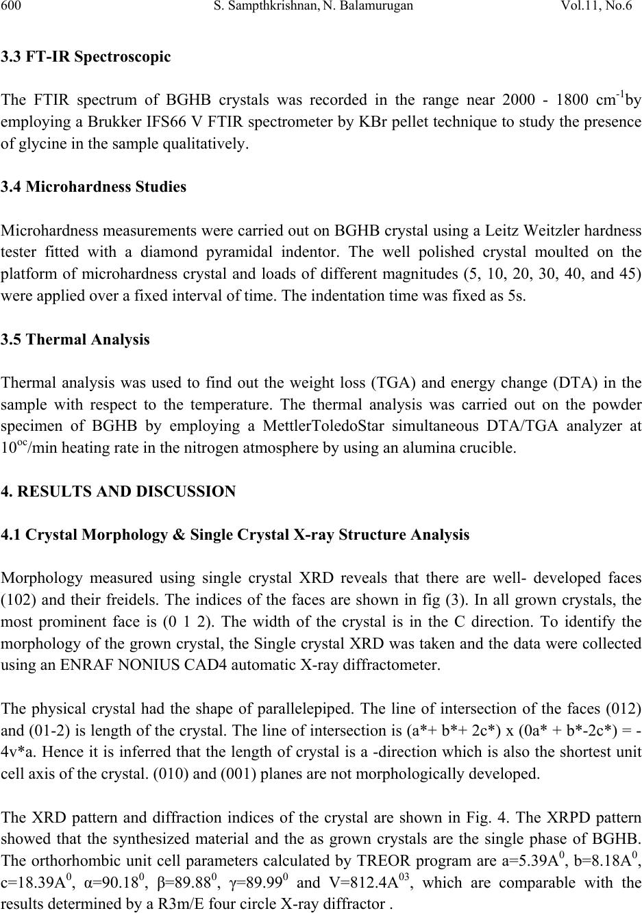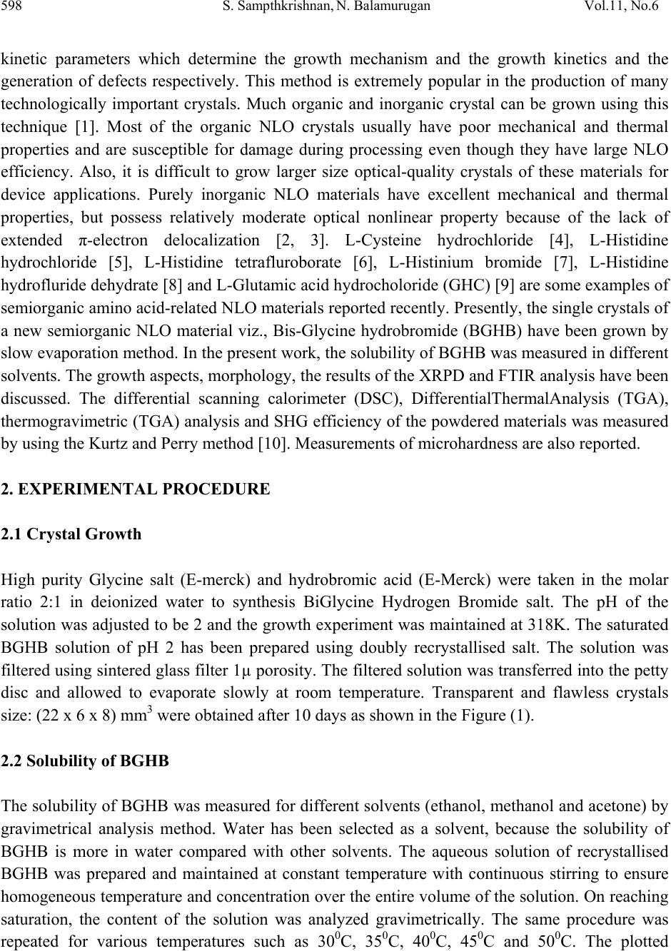 ![]() Journal of Minerals & Materials Characterization & Engineering, Vol. 11, No.6, pp.597-607, 2012 jmmce.org Printed in the USA. All rights reserved 597 Growth and Characterization of New Non Linear Optical Bis-Glycine Hydro Bromide (BGHB) Single Crystal S. Sampthkrishnana *, N. Balamuruganb, R. Kumuthac, Y. Vidyalakshmid, S. Muthua a Department of Physics , Sri Venkateswara College of Engineering, Sriperumbudur, India. b Department of Physics, PERI Institute of Technology, Chennai-600 048, India. c Department of Physics, JAYA Engineering College, Chennai, India. d Departments of Physics, MIT, Anna University, Chennai-48. *Corresponding Author: Sambathk@svce.ac.in, n_rishibalaa@yahoo.co.in ABSTRACT A new non linear optical material, Bis-Glycine Hydro bromide (BGHB), has been synthesized. Single crystals of BGHB have been grown successfully by slow evaporation method. The solubility of the material was measured in various solvents such as ethanol, acetone and water. It was found to have extremely low solubility in ethanol and acetone. The grown crystals were characterized by recording the powder diffraction and identifying the diffracting planes. Using single crystal diffractometer the morphology of BGHB crystal was identified. Fourier transform infrared (FTIR) spectroscopic studies, optical behavior such as UV-visible-NIR absorption, Thermogravimetic (TG) and differential scanning calorimetric (DSC) analyses have been performed to show that BGHB is thermally stable up to 168.5oC and there is no phase transition and decomposition till 168.5oC. Anisotropy in the hardness behavior has been observed while measuring at different crystal planes by Vicker hardness test. Key words: Solubility, Grown from solution, Crystal structure, FT-IRspectroscopy, Micro hardness, 1. INTRODUCTION In the technological society, development of new devices has been introduced through the growth of single crystals. Crystals for practical and technological applications should have a well developed morphology and contain low density of defects predicted by thermodynamic and ![]() 598 S. Sampthkrishnan, N. Balamurugan Vol.11, No.6 kinetic parameters which determine the growth mechanism and the growth kinetics and the generation of defects respectively. This method is extremely popular in the production of many technologically important crystals. Much organic and inorganic crystal can be grown using this technique [1]. Most of the organic NLO crystals usually have poor mechanical and thermal properties and are susceptible for damage during processing even though they have large NLO efficiency. Also, it is difficult to grow larger size optical-quality crystals of these materials for device applications. Purely inorganic NLO materials have excellent mechanical and thermal properties, but possess relatively moderate optical nonlinear property because of the lack of extended π-electron delocalization [2, 3]. L-Cysteine hydrochloride [4], L-Histidine hydrochloride [5], L-Histidine tetrafluroborate [6], L-Histinium bromide [7], L-Histidine hydrofluride dehydrate [8] and L-Glutamic acid hydrocholoride (GHC) [9] are some examples of semiorganic amino acid-related NLO materials reported recently. Presently, the single crystals of a new semiorganic NLO material viz., Bis-Glycine hydrobromide (BGHB) have been grown by slow evaporation method. In the present work, the solubility of BGHB was measured in different solvents. The growth aspects, morphology, the results of the XRPD and FTIR analysis have been discussed. The differential scanning calorimeter (DSC), DifferentialThermalAnalysis (TGA), thermogravimetric (TGA) analysis and SHG efficiency of the powdered materials was measured by using the Kurtz and Perry method [10]. Measurements of microhardness are also reported. 2. EXPERIMENTAL PROCEDURE 2.1 Crystal Growth High purity Glycine salt (E-merck) and hydrobromic acid (E-Merck) were taken in the molar ratio 2:1 in deionized water to synthesis BiGlycine Hydrogen Bromide salt. The pH of the solution was adjusted to be 2 and the growth experiment was maintained at 318K. The saturated BGHB solution of pH 2 has been prepared using doubly recrystallised salt. The solution was filtered using sintered glass filter 1µ porosity. The filtered solution was transferred into the petty disc and allowed to evaporate slowly at room temperature. Transparent and flawless crystals size: (22 x 6 x 8) mm3 were obtained after 10 days as shown in the Figure (1). 2.2 Solubility of BGHB The solubility of BGHB was measured for different solvents (ethanol, methanol and acetone) by gravimetrical analysis method. Water has been selected as a solvent, because the solubility of BGHB is more in water compared with other solvents. The aqueous solution of recrystallised BGHB was prepared and maintained at constant temperature with continuous stirring to ensure homogeneous temperature and concentration over the entire volume of the solution. On reaching saturation, the content of the solution was analyzed gravimetrically. The same procedure was repeated for various temperatures such as 300C, 350C, 400C, 450C and 500C. The plotted ![]() Vol.11, No6 Growth and Characterization of New Non Linear Optical 599 solubility curve is as shown in the figure (2). From the figure, it is evident that the solubility increases with increase in temperature. Fig.1: Photograph of BGHB crystal. Fig.2. Solubility spectrum of BGHB single crystal 3. CHARACTERIZATION 3.1 Structure Elucidation using Single Cry st a l X - r a y D i f f r a c ti o n Single crystal powder X-ray diffraction pattern was recorded using a Siemens D500 diffractometer at room temperature (293K) with CuKa (X = 1.5418A) radiation for structural analysis of Bi-Glycine Hydrogen Bromide and the lattice parameters were calculated. 3.2 UV_Vis_Spectroscopic To know the optical transparency of the grown crystal, the UV_Vis absorbance spectrum of BHGB was recorded.using a carry 5E UV_Vis_NIR spectrophotometer. In the