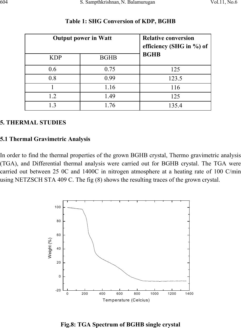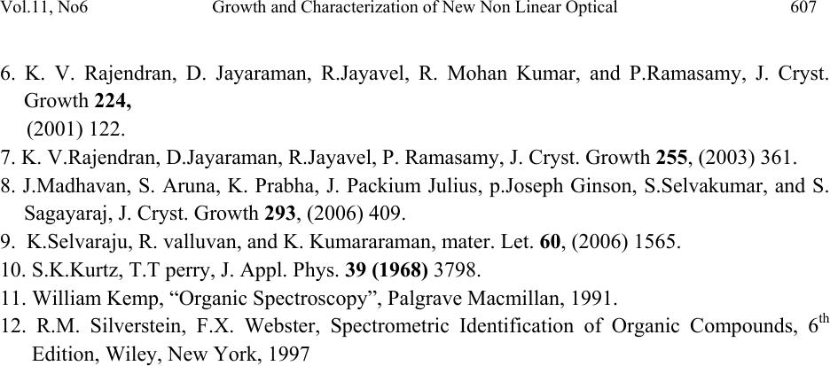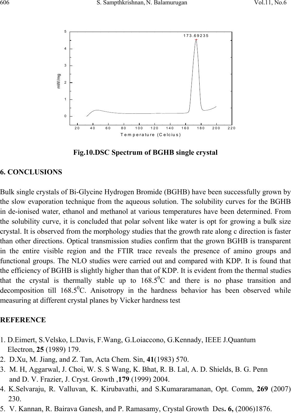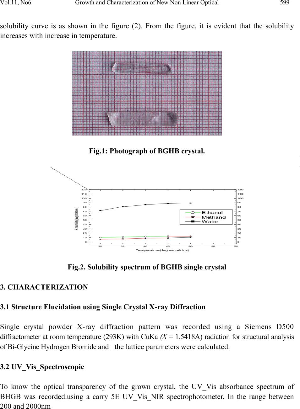 ![]() Journal of Minerals & Materials Characterization & Engineering, Vol. 11, No.6, pp.597-607, 2012 jmmce.org Printed in the USA. All rights reserved 597 Growth and Characterization of New Non Linear Optical Bis-Glycine Hydro Bromide (BGHB) Single Crystal S. Sampthkrishnana *, N. Balamuruganb, R. Kumuthac, Y. Vidyalakshmid, S. Muthua a Department of Physics , Sri Venkateswara College of Engineering, Sriperumbudur, India. b Department of Physics, PERI Institute of Technology, Chennai-600 048, India. c Department of Physics, JAYA Engineering College, Chennai, India. d Departments of Physics, MIT, Anna University, Chennai-48. *Corresponding Author: Sambathk@svce.ac.in, n_rishibalaa@yahoo.co.in ABSTRACT A new non linear optical material, Bis-Glycine Hydro bromide (BGHB), has been synthesized. Single crystals of BGHB have been grown successfully by slow evaporation method. The solubility of the material was measured in various solvents such as ethanol, acetone and water. It was found to have extremely low solubility in ethanol and acetone. The grown crystals were characterized by recording the powder diffraction and identifying the diffracting planes. Using single crystal diffractometer the morphology of BGHB crystal was identified. Fourier transform infrared (FTIR) spectroscopic studies, optical behavior such as UV-visible-NIR absorption, Thermogravimetic (TG) and differential scanning calorimetric (DSC) analyses have been performed to show that BGHB is thermally stable up to 168.5oC and there is no phase transition and decomposition till 168.5oC. Anisotropy in the hardness behavior has been observed while measuring at different crystal planes by Vicker hardness test. Key words: Solubility, Grown from solution, Crystal structure, FT-IRspectroscopy, Micro hardness, 1. INTRODUCTION In the technological society, development of new devices has been introduced through the growth of single crystals. Crystals for practical and technological applications should have a well developed morphology and contain low density of defects predicted by thermodynamic and ![]() 598 S. Sampthkrishnan, N. Balamurugan Vol.11, No.6 kinetic parameters which determine the growth mechanism and the growth kinetics and the generation of defects respectively. This method is extremely popular in the production of many technologically important crystals. Much organic and inorganic crystal can be grown using this technique [1]. Most of the organic NLO crystals usually have poor mechanical and thermal properties and are susceptible for damage during processing even though they have large NLO efficiency. Also, it is difficult to grow larger size optical-quality crystals of these materials for device applications. Purely inorganic NLO materials have excellent mechanical and thermal properties, but possess relatively moderate optical nonlinear property because of the lack of extended π-electron delocalization [2, 3]. L-Cysteine hydrochloride [4], L-Histidine hydrochloride [5], L-Histidine tetrafluroborate [6], L-Histinium bromide [7], L-Histidine hydrofluride dehydrate [8] and L-Glutamic acid hydrocholoride (GHC) [9] are some examples of semiorganic amino acid-related NLO materials reported recently. Presently, the single crystals of a new semiorganic NLO material viz., Bis-Glycine hydrobromide (BGHB) have been grown by slow evaporation method. In the present work, the solubility of BGHB was measured in different solvents. The growth aspects, morphology, the results of the XRPD and FTIR analysis have been discussed. The differential scanning calorimeter (DSC), DifferentialThermalAnalysis (TGA), thermogravimetric (TGA) analysis and SHG efficiency of the powdered materials was measured by using the Kurtz and Perry method [10]. Measurements of microhardness are also reported. 2. EXPERIMENTAL PROCEDURE 2.1 Crystal Growth High purity Glycine salt (E-merck) and hydrobromic acid (E-Merck) were taken in the molar ratio 2:1 in deionized water to synthesis BiGlycine Hydrogen Bromide salt. The pH of the solution was adjusted to be 2 and the growth experiment was maintained at 318K. The saturated BGHB solution of pH 2 has been prepared using doubly recrystallised salt. The solution was filtered using sintered glass filter 1µ porosity. The filtered solution was transferred into the petty disc and allowed to evaporate slowly at room temperature. Transparent and flawless crystals size: (22 x 6 x 8) mm3 were obtained after 10 days as shown in the Figure (1). 2.2 Solubility of BGHB The solubility of BGHB was measured for different solvents (ethanol, methanol and acetone) by gravimetrical analysis method. Water has been selected as a solvent, because the solubility of BGHB is more in water compared with other solvents. The aqueous solution of recrystallised BGHB was prepared and maintained at constant temperature with continuous stirring to ensure homogeneous temperature and concentration over the entire volume of the solution. On reaching saturation, the content of the solution was analyzed gravimetrically. The same procedure was repeated for various temperatures such as 300C, 350C, 400C, 450C and 500C. The plotted ![]() Vol.11, No6 Growth and Characterization of New Non Linear Optical 599 solubility curve is as shown in the figure (2). From the figure, it is evident that the solubility increases with increase in temperature. Fig.1: Photograph of BGHB crystal. Fig.2. Solubility spectrum of BGHB single crystal 3. CHARACTERIZATION 3.1 Structure Elucidation using Single Cry st a l X - r a y D i f f r a c ti o n Single crystal powder X-ray diffraction pattern was recorded using a Siemens D500 diffractometer at room temperature (293K) with CuKa (X = 1.5418A) radiation for structural analysis of Bi-Glycine Hydrogen Bromide and the lattice parameters were calculated. 3.2 UV_Vis_Spectroscopic To know the optical transparency of the grown crystal, the UV_Vis absorbance spectrum of BHGB was recorded.using a carry 5E UV_Vis_NIR spectrophotometer. In the
