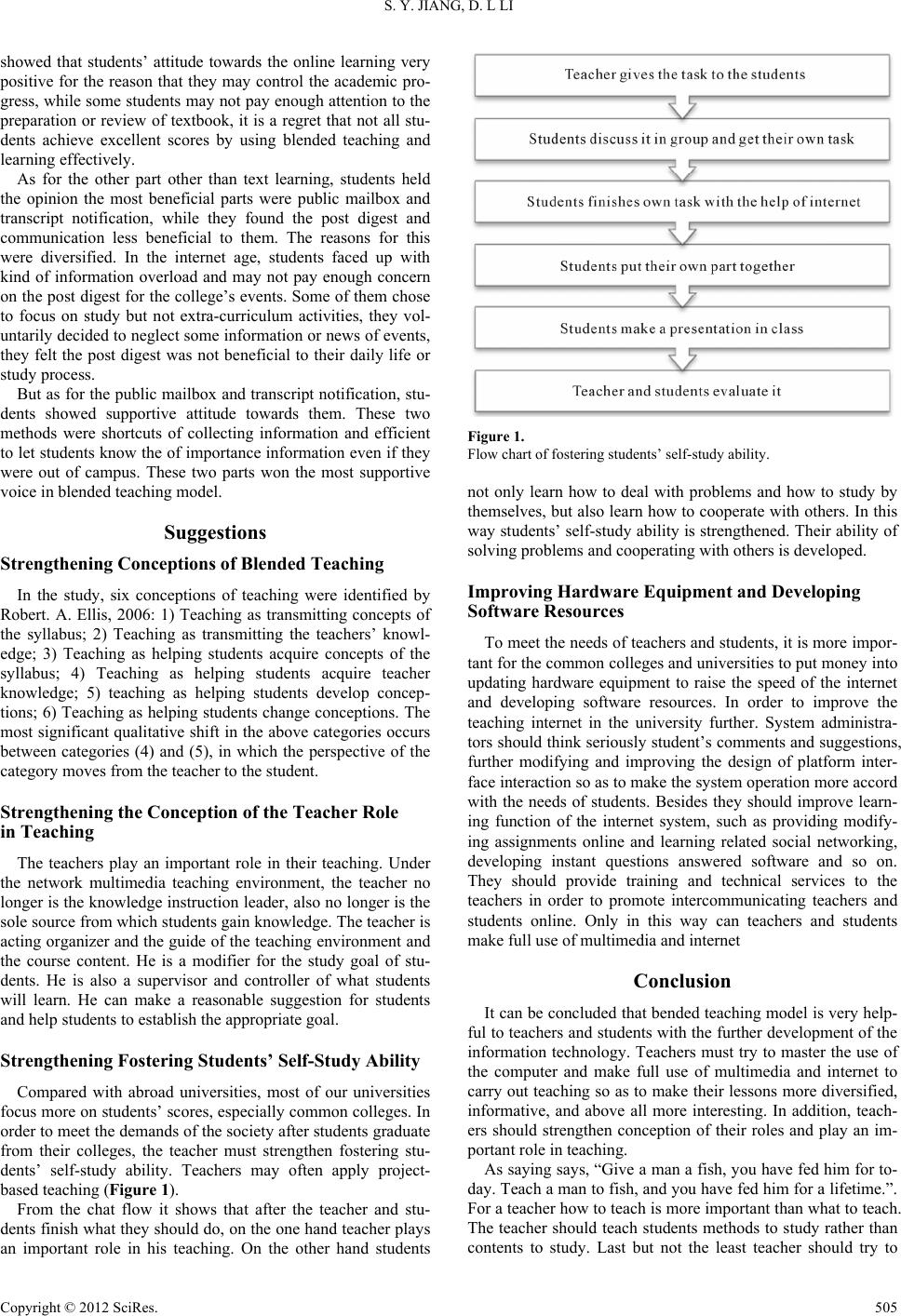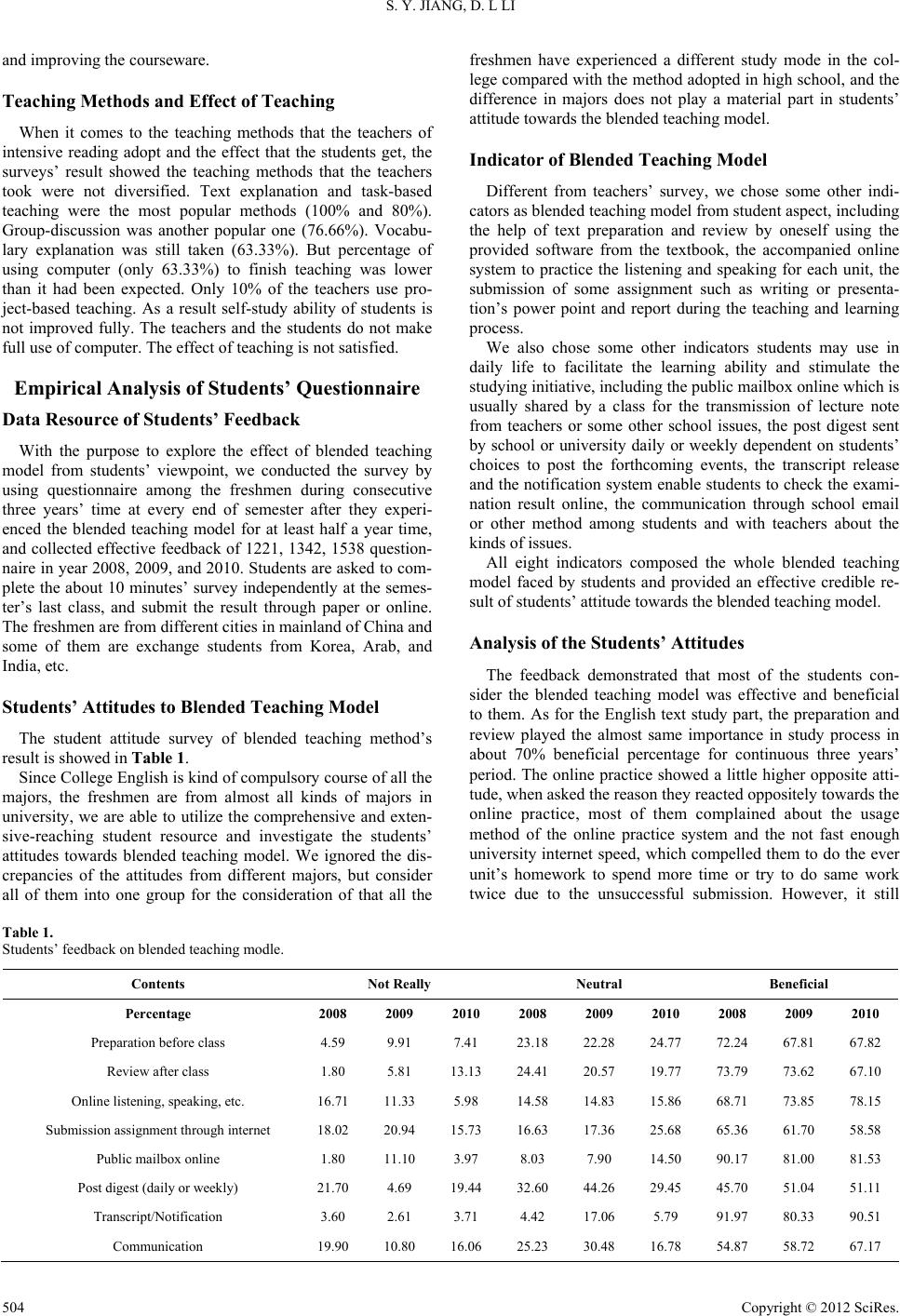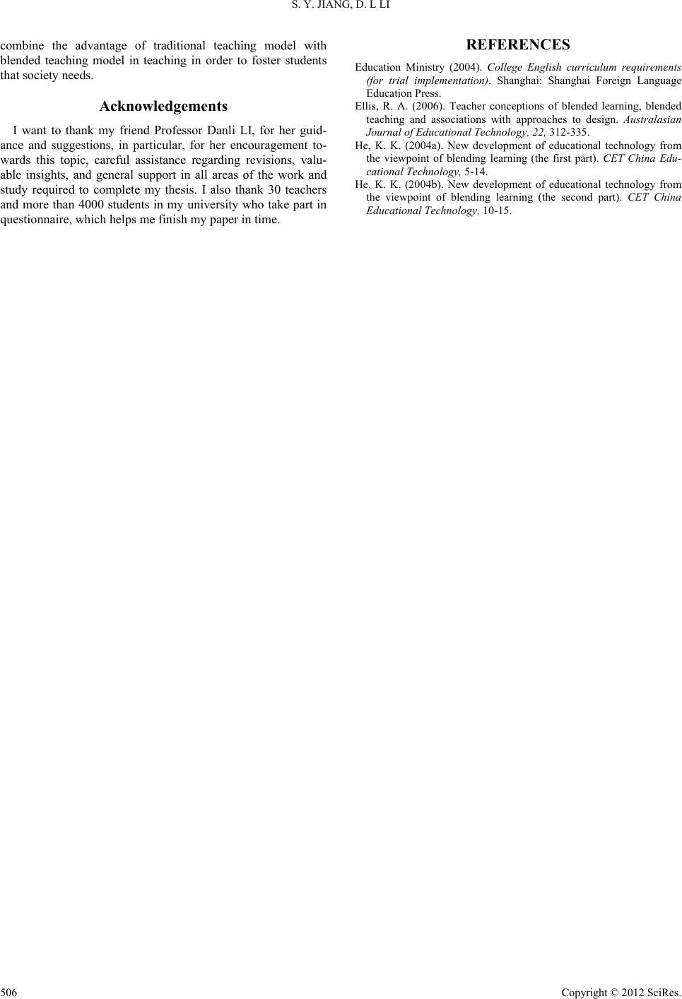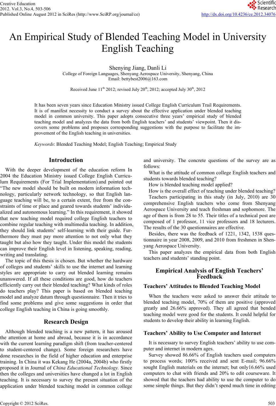 ![]() Creative Education 2012. Vol.3, No.4, 503-506 Published Online August 2012 in SciRes (http://www.SciRP.org/journal/ce) http://dx.doi.org/10.4236/ce.2012.34076 Copyright © 2012 SciRe s . 503 An Empirical Study of Blended Teaching Model in University English Teaching Shenying Jiang, Danli Li College of Foreign Languages, Shenyang Aerospace University, Shenyang, China Email: bettybest2006@163.com Received June 11th 2012; revised July 20th, 2012; accepted July 30th, 2012 It has been seven years since Education Ministry issued College English Curriculum Trail Requirements. It is of manifest necessity to conduct a survey about the effective application under blended teaching model in common university. This paper adopts consecutive three years’ empirical study of blended teaching model and analyzes the data from both English teachers’ and students’ viewpoint. Then it dis- covers some problems and proposes corresponding suggestions with the purpose to facilitate the im- provement of the English teaching in universities. Keywords: Blended Teaching Model; English Teaching; Empirical Study Introduction With the deeper development of the education reform In 2004 the Education Ministry issued College English Curricu- lum Requirements (For Trial Implementation) and pointed out “The new model should be built on modern information tech- nology, particularly network technology, so that English lan- guage teaching will be, to a certain extent, free from the con- straints of time or place and geared towards students’ individu- alized and autonomous learni ng.” In this requirement, it showed that new teaching model required college English teachers to combine regular teaching with multimedia teaching. In addition, they should link students’ self-learning with their guide. Fur- thermore they must pay more attention to not only what they taught but also how they taught. Under this model the students can improve their English level in listening, speaking, reading, writing and translating. The topic of this thesis is chosen. But whether the hardware of colleges and students’ skills to use the internet and learning styles are appropriate to carry out blended learning remains unanswered. If all these conditions are good, how do teachers efficiently carry out their blended teaching? What kinds of roles do teachers play? This paper is based on blended teaching model and analyze datum through questionnaire. Then it tries to find some problems and give some suggestions in order that college English teaching in China is going smoothly. Research Design Although blended teaching is a new pattern, it has aroused the attention at home and abroad, because it is in accordance with the current learning paradigm shift (from teacher-centered to student-centered change). Some foreign researchers have done researches in the field of higher education and enterprise training. In China it was Kekang He (2004a, 2004b) who firstly proposed it in Journal of China Educational Technology. Since then the colleges and universities have changed a lot in English teaching. It is necessary to survey the present situation of the application under blended teaching model in common college and university. The concrete questions of the survey are as follows: What is the attitude of common college English teachers and students towards blended teaching? How is blended teaching model applied? How is the overall effect of teaching under blended teaching? Teachers participating in this study (in July, 2010) are 30 comprehensive English teachers who come from Shenyang Aerospace University and teach freshman and sophomore. The age of them is from 28 to 55. Their titles of a technical post are composed of 1 professor, 11 vice professors and 18 lecturers. The results of the 30 questionnaires are effective. Besides, there was the feedback of 1221, 1342, 1538 ques- tionnaire in year 2008, 2009, and 2010 from freshmen in Shen- yang Aerospace Unive r si ty. This paper analyzes the empirical data from both English teachers and students’ standing point. Empirical Analysis of English Teachers’ Feedback Teachers’ Attitudes to Blended Teaching Model When the teachers were asked to answer their attitude to blended teaching model, 70% of them are positive (approved greatly and 26.66% approved). They all agreed that bended teaching model were good for the students. It could helpful for students to develop their ability in learning English. Teachers’ Ability to Use Computer and Internet It is necessary to survey English teachers’ ability to use com- puter and internet in modern ages. Survey showed 86.66% of English teachers used computers to process words; 100% received and sent E-mail; 96.66% sought English materials on the internet; but only16.66% used computers to chat with friends and 20% to edit courseware. It showed that the teachers had ability to use the computer to do some simple things. But they didn’t spend much time in editing ![]() S. Y. JIANG, D. L LI and improving the courseware. Teaching Methods and Effect of Teaching When it comes to the teaching methods that the teachers of intensive reading adopt and the effect that the students get, the surveys’ result showed the teaching methods that the teachers took were not diversified. Text explanation and task-based teaching were the most popular methods (100% and 80%). Group-discussion was another popular one (76.66%). Vocabu- lary explanation was still taken (63.33%). But percentage of using computer (only 63.33%) to finish teaching was lower than it had been expected. Only 10% of the teachers use pro- ject-based teaching. As a result self-study ability of students is not improved fully. The teachers and the students do not make full use of computer. The effect of teaching is not satisfied. Empirical Analysis of Students’ Questionnaire Data Resource of Students’ Feedback With the purpose to explore the effect of blended teaching model from students’ viewpoint, we c