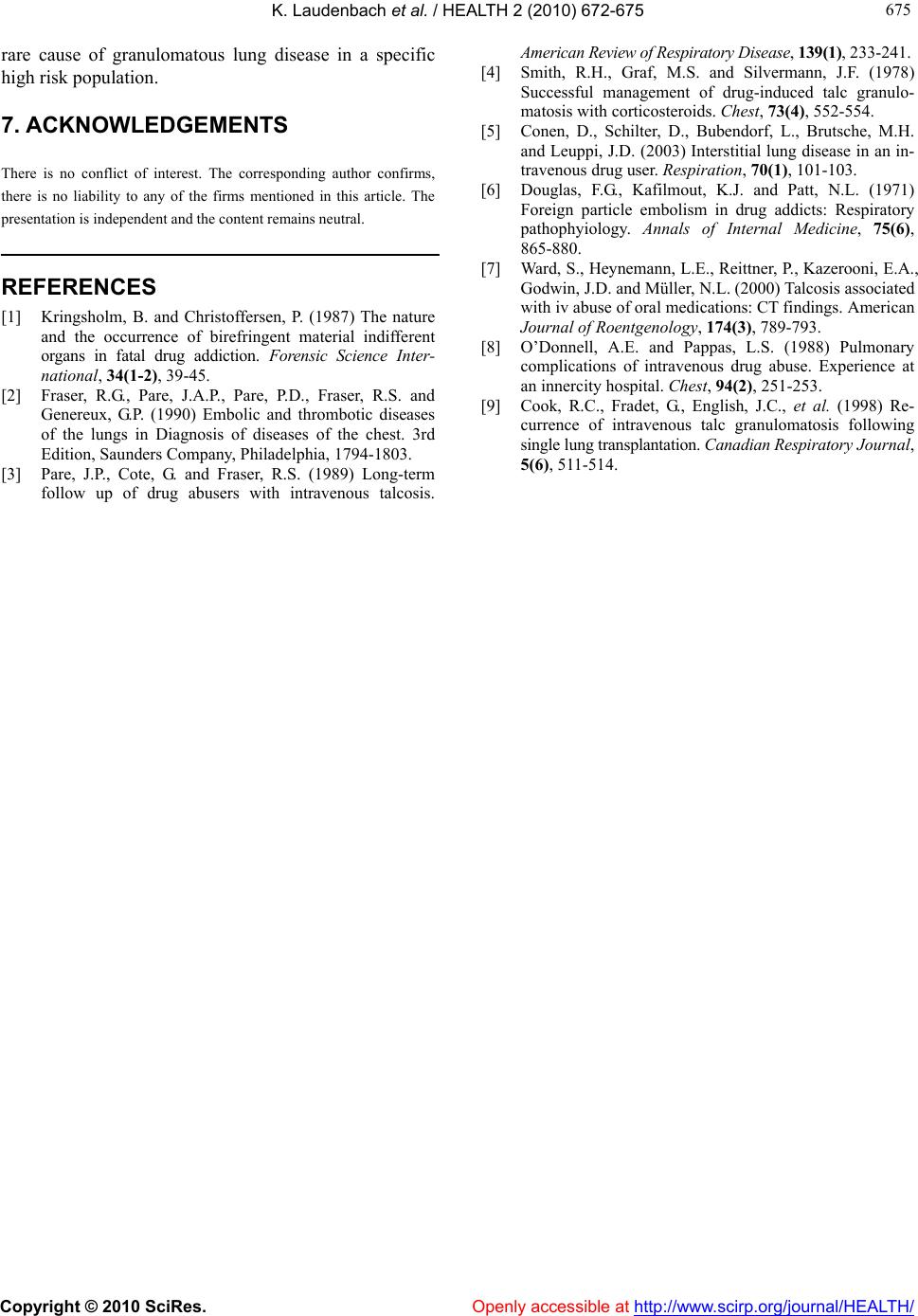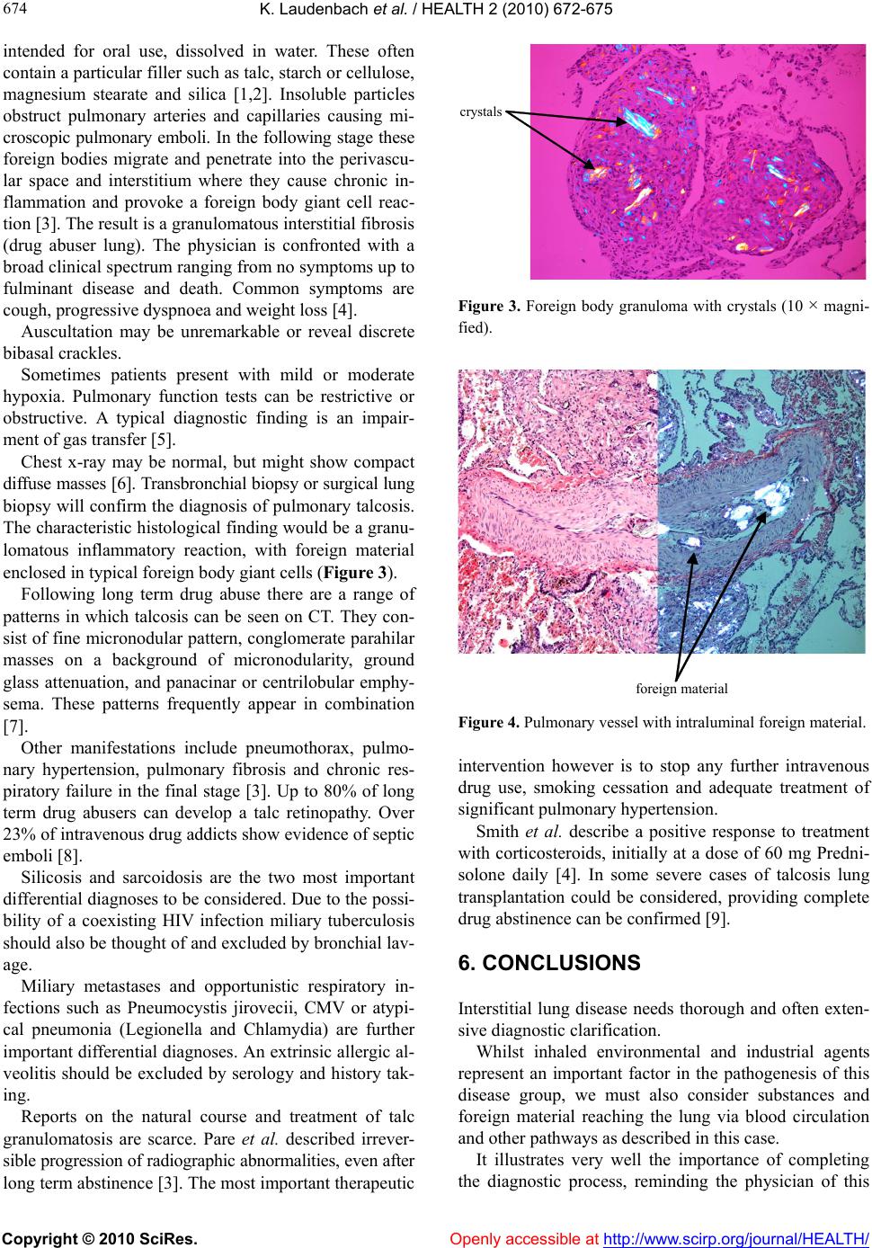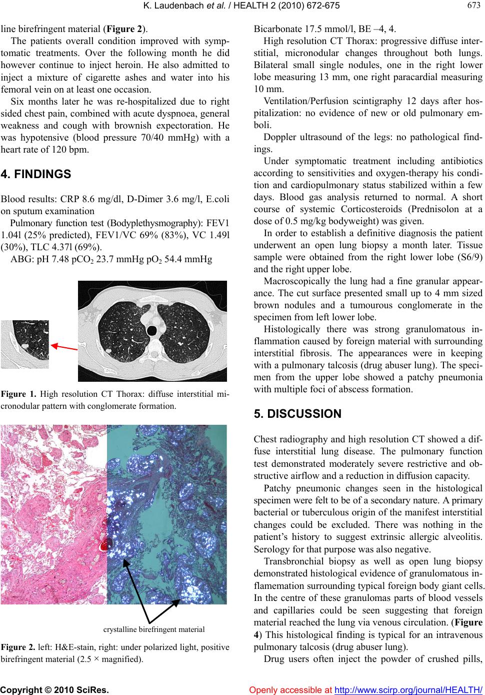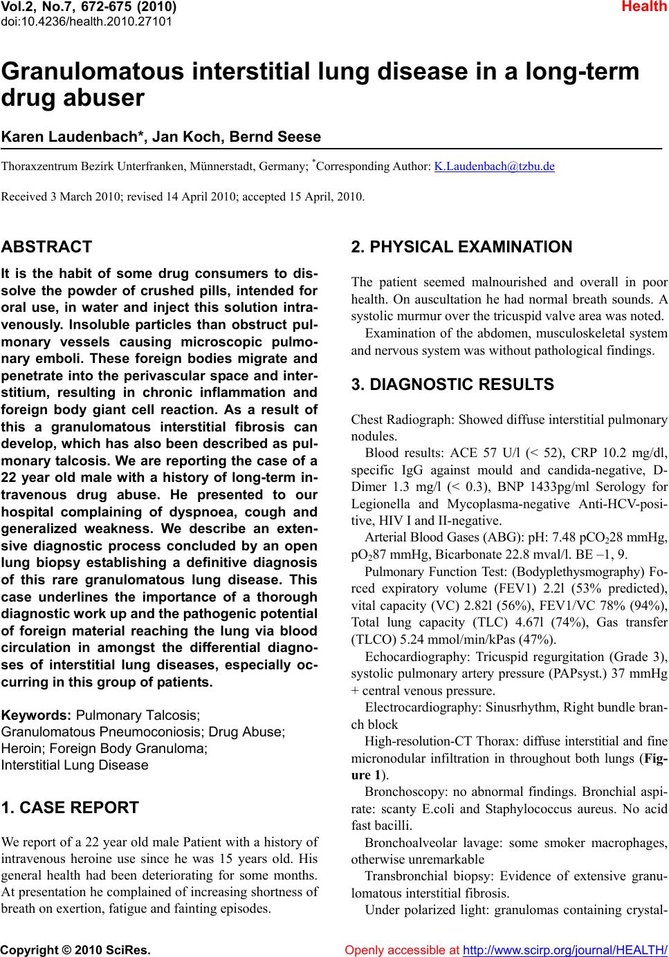 ![]() Vol.2, No.7, 672-675 (2010) doi:10.4236/health.2010.27101 Copyright © 2010 SciRes. Openly accessible at http://www.scirp.org/journal/HEALTH/ Health Granulomatous interstitial lung disease in a long-term drug abuser Karen Laudenbach*, Jan Koch, Bernd Seese Thoraxzentrum Bezirk Unterfranken, Münnerstadt, Germany; *Corresponding Author: K.Laudenbach@tzbu.de Received 3 March 2010; revised 14 April 2010; accepted 15 April, 2010. ABSTRACT It is the habit of some drug consumers to dis- solve the powder of crushed pills, intended for oral use, in water and inject this solution intra- venously. Insoluble particles than obstruct pul- monary vessels causing microscopic pulmo- nary emboli. These foreign bodies migrate and penetrate into the perivascular space and inter- stitium, resulting in chronic inflammation and foreign body giant cell reaction. As a result of this a granulomatous interstitial fibrosis can develop, which has also been described as pul- monary talcosis. We are reporting the case of a 22 year old male with a history of long-term in- travenous drug abuse. He presented to our hospital complaining of dyspnoea, cough and generalized weakness. We describe an exten- sive diagnostic process concluded by an open lung biopsy establishing a definitive diagnosis of this rare granulomatous lung disease. This case underlines the importance of a thorough diagnostic work up and the pathogenic potentia l of foreign material reaching the lung via blood circulation in amongst the differential diagno- ses of interstitial lung diseases, especially oc- curring in this group of patients. Keywords: Pulmonary Talcosis; Granuloma tous Pneumoconiosis; Dr u g Abuse; Heroin; Foreign Body Granuloma; Interstitial Lung Disease 1. CASE REPORT We report of a 22 year old male Patient with a history of intravenous heroine use since he was 15 years old. His general health had been deteriorating for some months. At presentation he complained of increasing shortness of breath on exertion, fatigue and fainting episodes. 2. PHYSICAL EXAMINATION The patient seemed malnourished and overall in poor health. On auscultation he had normal breath sounds. A systolic murmur over the tricuspid valve area was noted. Examination of the abdomen, musculoskeletal system and nervous system was without pathological findings. 3. DIAGNOSTIC RESULTS Chest Radiograph: Showed diffuse interstitial pulmonary nodules. Blood results: ACE 57 U/l (< 52), CRP 10.2 mg/dl, specific IgG against mould and candida-negative, D- Dimer 1.3 mg/l (< 0.3), BNP 1433pg/ml Serology for Legionella and Mycoplasma-negative Anti-HCV-posi- tive, HIV I and II-negative. Arterial Blood Gases (ABG): pH: 7.48 pCO228 mmHg, pO287 mmHg, Bicarbonate 22.8 mval/l. BE –1, 9. Pulmonary Function Test: (Bodyplethysmography) Fo- rced expiratory volume (FEV1) 2.2l (53% predicted), vital capacity (VC) 2.82l (56%), FEV1/VC 78% (94%), Total lung capacity (TLC) 4.67l (74%), Gas transfer (TLCO) 5.24 m m ol /m i n/ kPas (47% ). Echocardiography: Tricuspid regurgitation (Grade 3), systolic pulmonary artery pressure (PAPsyst.) 37 mmHg + central venous pre ssure. Electrocardiography: Sinusrhythm, Right bundle bran- ch block High-resolution-CT Thorax: diffuse interstitial and fine micronodular infiltration in throughout both lungs (Fig- ure 1). Bronchoscopy: no abnormal findings. Bronchial aspi- rate: scanty E.coli and Staphylococcus aureus. No acid fast bacilli. Bronchoalveolar lavage: some smoker macrophages, otherwise unremarkable Transbronchial biopsy: Evidence of extensive granu- lomatous interstitial fibro sis. Under polarized light: granulomas containing crystal- ![]() K. Laudenbach et al. / HEALTH 2 (2010) 67 2-675 Copyright © 2010 SciRes. Openly accessible at http://www.scirp.org/journal/HEALTH/ 673 673 line birefringent material (Figure 2). The patients overall condition improved with symp- tomatic treatments. Over the following month he did however continue to inject heroin. He also admitted to inject a mixture of cigarette ashes and water into his femoral vein on at least one occasion. Six months later he was re-hospitalized due to right sided chest pain, combined with acute dyspnoea, general weakness and cough with brownish expectoration. He was hypotensive (blood pressure 70/40 mmHg) with a heart rate of 12 0 bpm. 4. FINDINGS Blood results: CRP 8.6 mg/dl, D-Dimer 3.6 mg/l, E.coli on sputum examination Pulmonary function test (Bodyplethysmography): FEV1 1.04l (25% predicted), FEV1/VC 69% (83%), VC 1.49l (30%), TL C 4.37l (69%). ABG: pH 7.48 pCO2 23.7 mmHg pO2 54.4 mmHg Figure 1. High resolution CT Thorax: diffuse interstitial mi- cronodular pattern with conglomerate formation. crystalline bi refri ngent materi al Figure 2. left: H&E-stain, right: under polarized light, positive birefringent material (2.5 × magnified). Bicarbonate 17.5 mmol/l, BE –4, 4. High resolution CT Thorax: progressive diffuse inter- stitial, micronodular changes throughout both lungs. Bilateral small single nodules, one in the right lower lobe measuring 13 mm, one right paracardial measuring 10 mm. Ventilation/Perfusion scintigraphy 12 days after hos- pitalization: no evidence of new or old pulmonary em- boli. Doppler ultrasound of the legs: no pathological find- ings. Under symptomatic treatment including antibiotics according to sensitivities and oxygen-therapy his condi- tion and cardiopulmonary status stabilized within a few days. Blood gas analysis returned to normal. A short course of systemic Corticosteroids (Prednisolon at a dose of 0.5 mg/ kg b odyweight) was gi ven . In order to establish a definitive diagnosis the patient underwent an open lung biopsy a month later. Tissue sample were obtained from the right lower lobe (S6/9) and the right uppe r l obe. Macroscopically the lung had a fine granular appear- ance. The cut surface presented small up to 4 mm sized brown nodules and a tumourous conglomerate in the specimen from left lower lobe. Histologically there was strong granulomatous
