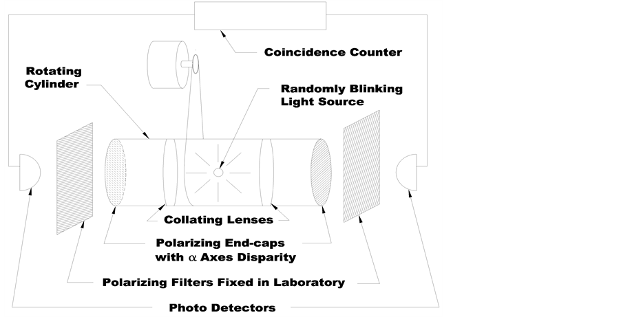 The second block of code simulates the generation of the correlated pulses. The fact that the polarisers mounted on the ends of the rotating cylinder depicted in Figure 1 have polarization axes fixed with respect to each other satisfies this stipulation. In addition, the pairs of signals are given by means of randomly timed flashes within the rotating cylinder, thereby simulating the random orientation of the pairs singly as naturally generated in experiments. This random bias angle makes the individual detection probabilities fully random at each station when taken individually.