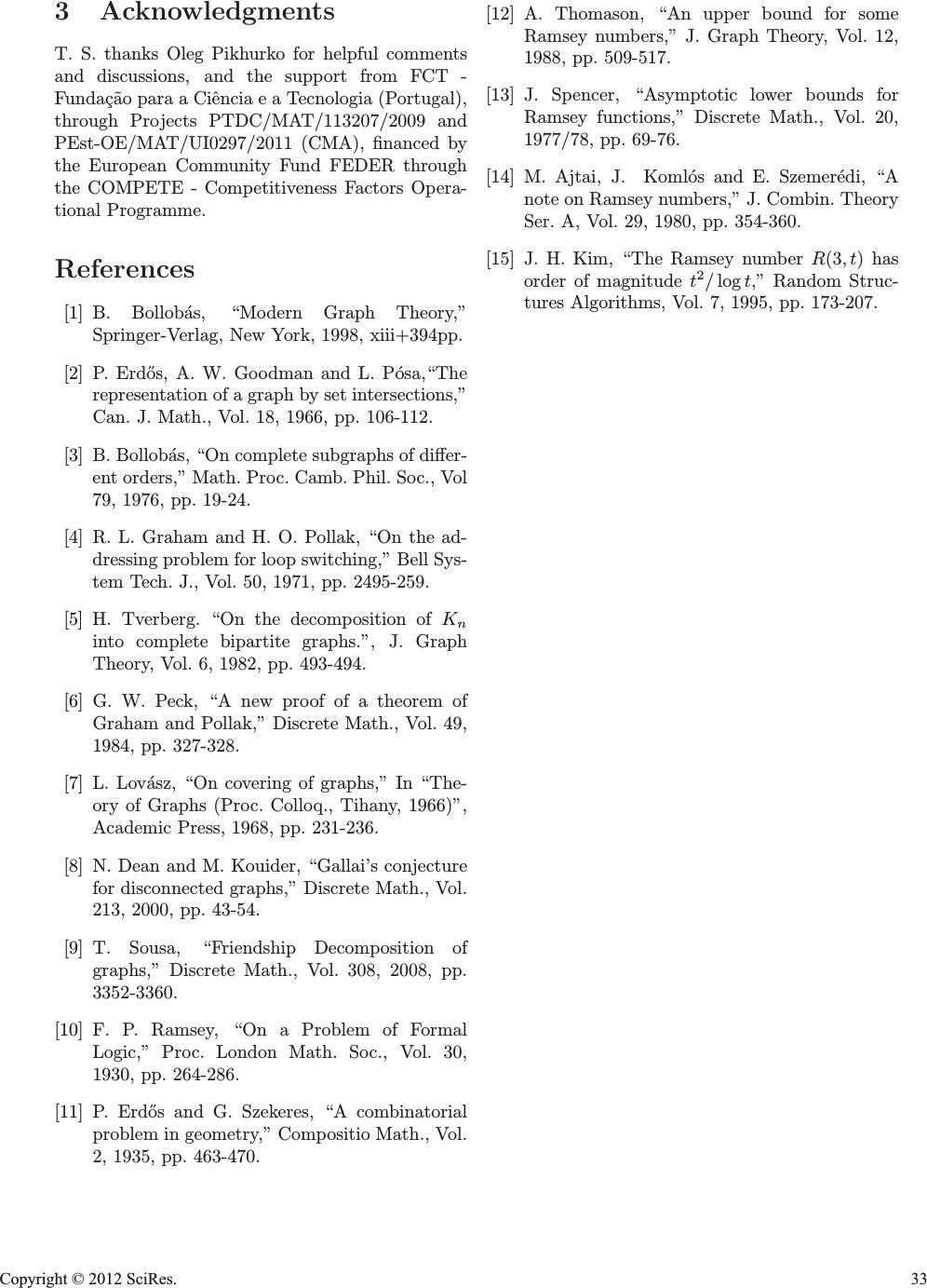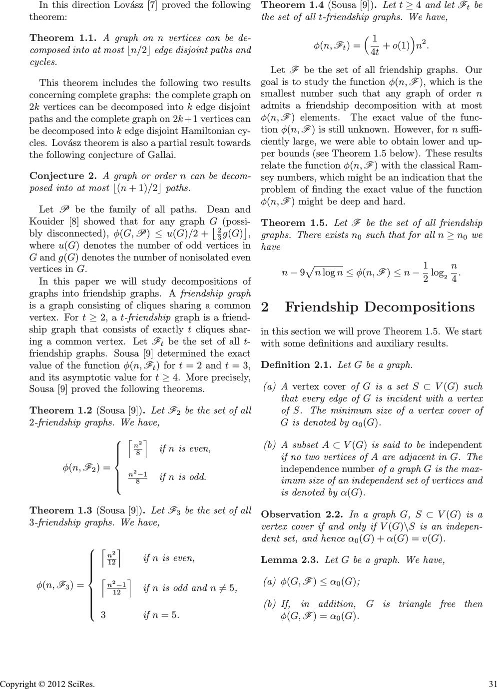 ![]() Friendship Decompositions of Graphs:The general problem Teresa Sousa∗ Departamento de Matem´atica and Centro de Matem´atica e Aplica¸c˜oes Faculdade de Ciˆencias e Tecnologia, Universidade Novade Lisboa Quinta da Torre, 2829-516 Caparica, Portugal tmjs@fct.unl.pt September 24, 2012 Abstract– A friendshipgraph isa graphconsisting ofcliques sharinga commonvertex.In thispaper we investigate the maximum number of elements in an optimal friendship decomposition of graphs of order n.We obtain upper and lower bounds for this number.These bounds relate this problem with the classical Ramsey numbers. Keywords: Graph Decompositions; Friendship Graph; Friendship Decompositions 1 Introduction For notation and terminology the reader is referred to [1].All graphsconsideredhereare finiteand simple, i.e., they have no loops or multiple edges. Let Hbe a fixed family of graphs.An H- decomposition of a given graph Gis a partition of its edge set into subgraphs that are isomorphic to elements of H.We define φ(G, H) as the mini- mum number of elements in an H-decomposition of G.One ofthe main problemsin graphdecom- positionsis the one of findingthe smallest number φ(n, H), such that, anygraph oforder nadmits an H-decomposition with at most φ(n, H)elements. This problem has been studied for some well known families ofgraphs, such as, cliques, bipartitegraphs, cycles and paths. Aclique is a complete graph and a clique de- composition or a cliquepartitionof agraph isa decomposition of itsedge set intoedge disjoint cliques. Erd˝os, Goodman and P´osa [2] showed that the edgesof anygraph onnvertices canbe de- composed into at most n2/4cliques.They also showed that aminimum cliquedecompositionhas exactly n2/4cliquesif andonly ifthe graphis pre- cisely Kn/2,n/2.Further,inthe decomposition they onlyneedto useedgesandtriangles.Later Bollob´as [3]generalized this resultby showingthat a graph of order ncan be decomposed into at most tp−1(n) edge disjoint cliquesof orderp(p≥4) and single edges.By tp−1(n)wedenotethenumberof edges inthe Tur´angraph of ordern,Tp−1(n), which is the uniquecomplete (p−1)-partite graphon n vertices that has themaximum number ofedges. Furthermore,for p≥4it wasalsoproved that Tp−1(n)istheonlygraph thatcannotbedecom- posed into fewer than tp−1(n) edge disjoint cliques of order pand single edges. Let Bdenote thefamilyof allcomplete bipar- tite graphs.It is easyto see thatthe edgesof thecompletegraphKncanbe decomposed into n−1 edgedisjointcomplete bipartite subgraphs, since Kndecomposesinto edge disjointcopiesof the starsK1,n−1,K 1,n−2,...,K 1,2,K 1,1. Graham and Pollak[4] proved that Kncannot be partitioned into fewer than n−1 edge disjoint completebipar- tite graphs.Therefore, φ(Kn,B)=n−1.This re- sult of Graham and Pollak was motivated by an ad- dressing problemin communications networks and simple proofs were found later by Tverberg [5] and Peck [6]. Consider now the family Cof all cycles, then it is easyto seethat agraphadmits acycle decompo- sition ifan onlyif allits verticeshaveevendegree. In this case, Haj´os made the following conjecture. Conjecture 1.Every graphGon nverticeswith all degrees even can bedecomposed into at most n/2edge disjointcycles. Open Journal of Applied Sciences Supplement:2012 world Congress on Engineering and Technology 30 Cop y ri g ht © 2012 SciRes. ![]() In this direction Lov´asz [7] proved thefollowing theorem: Theorem 1.1. A graph on nvertices can be de- composed into at most n/2edge disjoint paths and cycles. This theorem includes the following two results concerning complete graphs:the completegraph on 2kverticescan be decomposedinto kedge disjoint paths and thecomplete graph on 2k+1 vertices can bedecomposedinto kedge disjointHamiltonian cy- cles. Lov´asz theorem is also a partial result towards the following conjecture of Gallai. Conjecture 2.Agraphororder ncan bedecom- posedinto at most (n+1)/2paths. Let Pbethefamily ofallpaths.Deanand Kouider[8] showedthatfor anygraphG(possi- bly disconnected), φ(G, P)≤u(G)/2+2 3g(G), where u(G) denotes the number of odd verticesin Gandg(G) denotesthe number of nonisolatedeven vertices in G. In this paper we will studydecompositions of graphs into friendship graphs.Afriendship graph is agraph consistingof cliquessharing acommon vertex.For t≥2, a t-friendship graph isafriend- ship graph that consists of exactly tcliques shar- ing a common vertex.Let Ftbe the set of all t- friendship graphs.Sousa [9]determinedthe exact value ofthefunctionφ(n, Ft)fort=2 andt=3, and its asymptoticvaluefor t≥4.More precisely, Sousa [9] proved the following theorems. Theorem 1.2 (Sousa[9]).Let F2bethe set of all 2-friendship graphs.We have, φ(n, F2)=⎧ ⎪ ⎪ ⎪ ⎨ ⎪ ⎪ ⎪ ⎩ n2 8if nis even, n2−1 8if nis odd. Theorem 1.3 (Sousa[9]).Let F3bethe set of all 3-friendship graphs.We have, φ(n, F3)= ⎧ ⎪ ⎪ ⎪ ⎪ ⎪ ⎪ ⎨ ⎪ ⎪ ⎪ ⎪ ⎪ ⎪ ⎩ n2 12 if nis even, n2−1 12 if nis odd and n=5, 3if n=5. Theorem 1.4(Sousa [9]).Let t≥4andlet Ftbe the setof all t-friendship graphs.We have, φ(n, Ft)=1 4t+o(1)n2. Let Fbe the set of all friendship graphs.Our goal is to study the functionφ(n, F), which is the smallest number suchthat any graphof order n admits afriendshipdecomposition withatmost φ(n, F) elements.The exactvalue ofthe func- tion φ(n, F) isstill unknown.However, for nsuffi- ciently large,wewereable toobtain lower andup- per bounds (see Theorem 1.5below).These results relate the functionφ(n, F) with the classical Ram- sey numbers, which might be an indication that the problem offindingtheexact value of thefunction φ(n, F) might be deep and hard. Theorem 1.5.Let Fbe the set of all friendship graphs.There exists n0suchthat for alln≥n0we have n−9nlog n≤φ(n,F)≤n−1 2log2 n 4. 2Friendship Decompositions in this section we willproveTheorem 1.5.Westart with some definitions and auxiliary results. Definition 2.1.Let Gbea graph. (a)Avertex cover of Gisa 