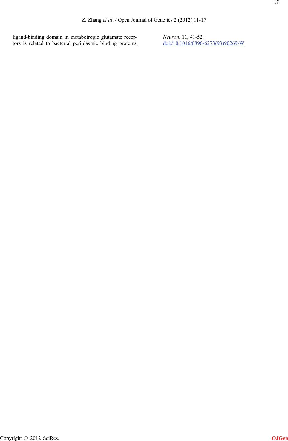 Z. Zhang et al. / Open Journal of Genetics 2 (2012) 11-17 Copyright © 2012 SciRes. OJGen ligand-binding domain in metabotropic glutamate recep- tors is related to bacterial periplasmic binding proteins, Neuron. 11, 41-52. doi:/10.1016/0896-6273(93)90269-W