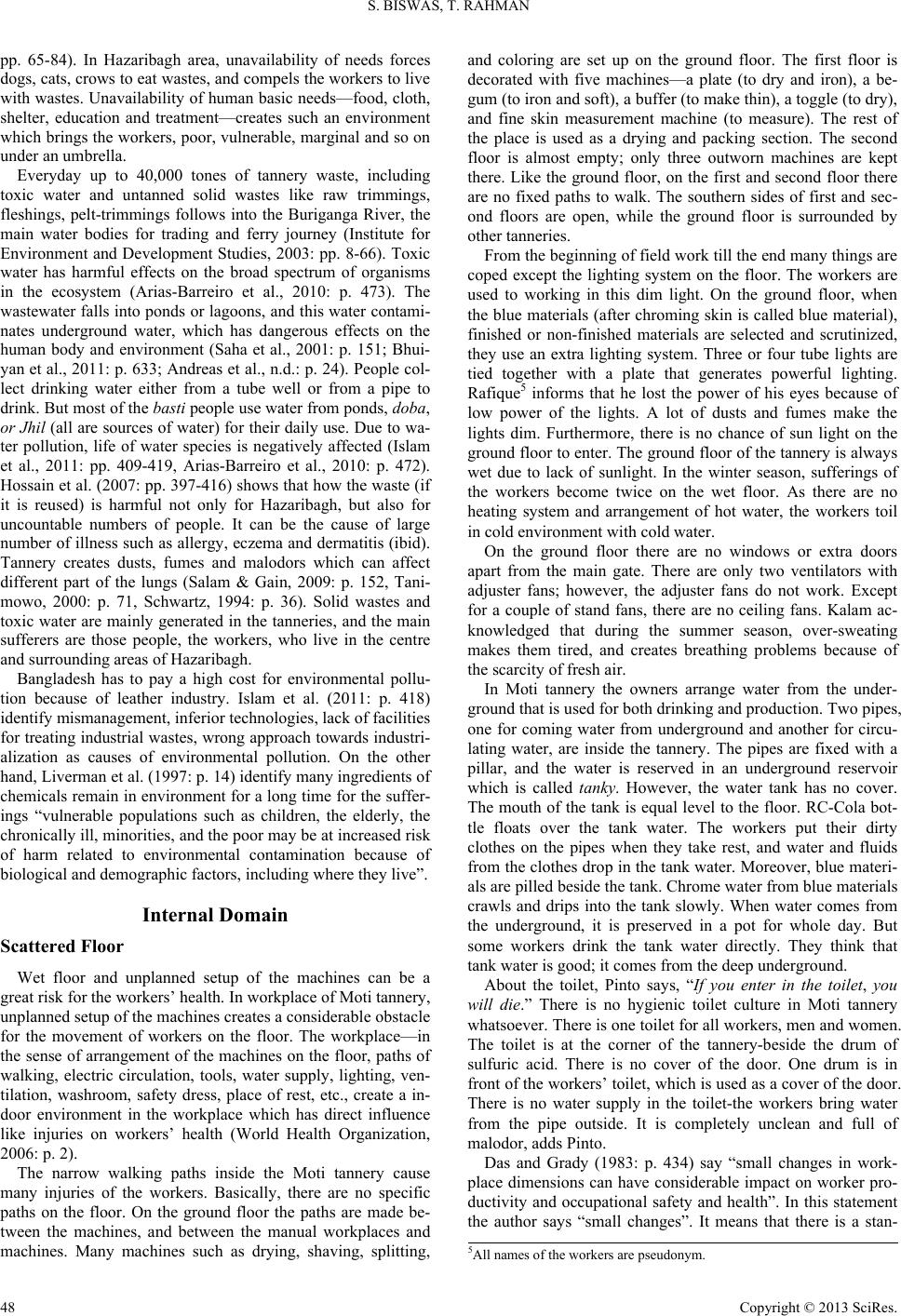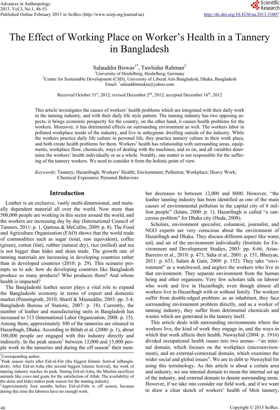Advances in Anthropology 2013. Vol.3, No.1, 46-53 Published Online February 2013 in SciRes (http://www.scirp.org/journal/aa) http://dx.doi.org/10.4236/aa.2013.31007 Copyright © 2013 SciRes. 46 The Effect of Working Place on Worker’s Health in a Tannery in Bangladesh Salauddin Biswas1*, Tawhidur Rahman2 1University of Heidelberg, Heidelberg, Germany 2Center for Sustainable Development (CSD), University of Liberal Arts Bangladesh, Dhaka, Bangla de s h Email: *salauddinmukta@yahoo.com Received October 31st, 2012; revised December 2nd, 2012; accepted December 16th, 2012 This article investigates the causes of workers’ health problems which are integrated with their daily work in the tanning industry, and with their daily life style pattern. The tanning industry has two opposing as- pects; it brings economic prosperity for the country, on the other hand, it causes health problems for the workers. Moreover, it has detrimental effects on surrounding environment as well. The workers labor in polluted workplace inside of the industry, and live in unhygienic dwelling outside of the industry. While the workers practice daily life culture in personal life, they practice tannery culture in their work place, and both create health problems for them. Workers’ health has relationship with surrounding areas, equip- ments, workplace floor, chemicals, ways of dealing with the machines, and so on, and all variables deter- mine the workers’ health individually or as a whole. Notably, one matter is not responsible for the suffer- ing of the tannery workers. We need to consider it from the holistic point of view. Keywords: Tannery; Hazaribagh; Workers’ Health; Environment; Pollution; Workplace; Heavy Work; Chemical Exposures; Personal Behaviors Introduction Leather is an exclusive, vastly multi-dimensional, and mutu- ally dependent material all over the world. Now more than 500,000 people are working in this sector around the world, and the workers are increasing day by day (International Council of Tanners, 2011: p. 1, Qattous & McCallin, 2009: p. 8). The Food and Agriculture Organization (FAO) shows that the world trade of commodities such as sugar (total, raw equivalent), coffee (green), cotton (lint), rubber (natural dry), rice (milled) and tea is not bigger than hides and skins trade. The growth rate of tanning materials are increasing in developing countries rather than in developed countries (2010: p. 29). This scenario pro- mpts us to ask: how do developing countries like Bangladesh produce so many products? Who produces them? And whose health is impacted? The Bangladeshi leather sector plays a vital role to expand the Bangladeshi economy in terms of export and domestic market (Penningroth, 2010; Sharif & Mainuddin, 2003: pp. 3-4; Bangladesh Bureau of Statistic, 2007: p. 18). Currently, the number of leather and manufacturing units in Bangladesh has increased to 313 (International Labor Organization , 2008: p. 15 ). Among them, approximately 300 of the tanneries are situated in Hazaribagh, Dhaka. According to Billah et al. (2000: p. 1), about 100,000 people are engaged with this industry directly and indirectly. In the peak season1 between 12,000 and 15,000 peo- ple work in the tanneries and during the off season2 their num- ber decreases to between 12,000 and 8000. However, “the leather tanning industry has been identified as one of the main causes of environmental pollution in the capital city of 8 mil- lion people” (Islam, 2000: p. 1). Hazaribagh is called “a can- cerous problem” for Dhaka city (Huda, 2008). Scholars, environment specialist, columnist, journalist, and NGO experts are very conscious about the environment of Hazaribagh and Dhaka. They discuss different aspect like water, soil, and air of the environment individually (Institute for En- vironment and Development Studies, 2003: pp. 8-66, Arias- Barreiro et al., 2010: p. 473, Saha et al., 2001: p. 151, Bhuiyan, 2011: p. 633, Salam & Gain, 2009: p. 152). They take “envi- ronment” as a watchword, and neglect the workers who live in that environment. They separate environment from the human being and other organisms. Very few scholars talk on laborer who work and live in Hazaribagh; even though almost all workers live in Hazaribagh with or without family. The workers suffer from double-edged problem: as an inhabitant, they face surrounding environment problem directly, and as a worker of tanning industry, they suffer from detrimental chemicals and wastes which are generated in the tannery itself. This article deals with surrounding environments where the workers live, the kind of work they engage in, and the ways in which that work affects their health. Nuwayhid (2004: p. 1916) divided occupational health issues into two arenas—“an inter- nal domain, which focuses on the workplace (microenviron- ment), and an external-contextual domain, which examines the wider social and global issues”. We are in debt to Nuwayhid for using this terminology. As this article is about a certain area and industry, we use internal domain to mean the internal set up of the industry, and external domain to denote sur rounding areas. However, if we t ake into con sider our field wo rk, and if we w an t to draw a clear sketch of workers’ health of Moti tannery, *Corresponding author. 1Peak season starts after Eid-ul-Fitr (the biggest Islamic festival inBangla- desh). After Eid-ul-Azha (the second biggest Islamic festival), the work o tanning indu str y reach es i ts peak. Du ri ng Ei d-u l-Azh a, th e Mus li m sacrif ices animals like cows and goats for the satisfaction of Allah. The availability o the skins and hides makes peak season for the tanning industry. 2Approximately four months before Eid-ul-Fithr is off season, because during this t ime the laborers have no enough work.