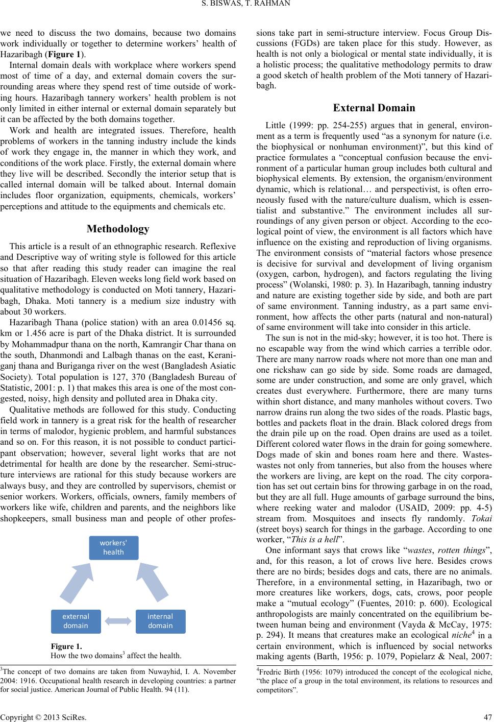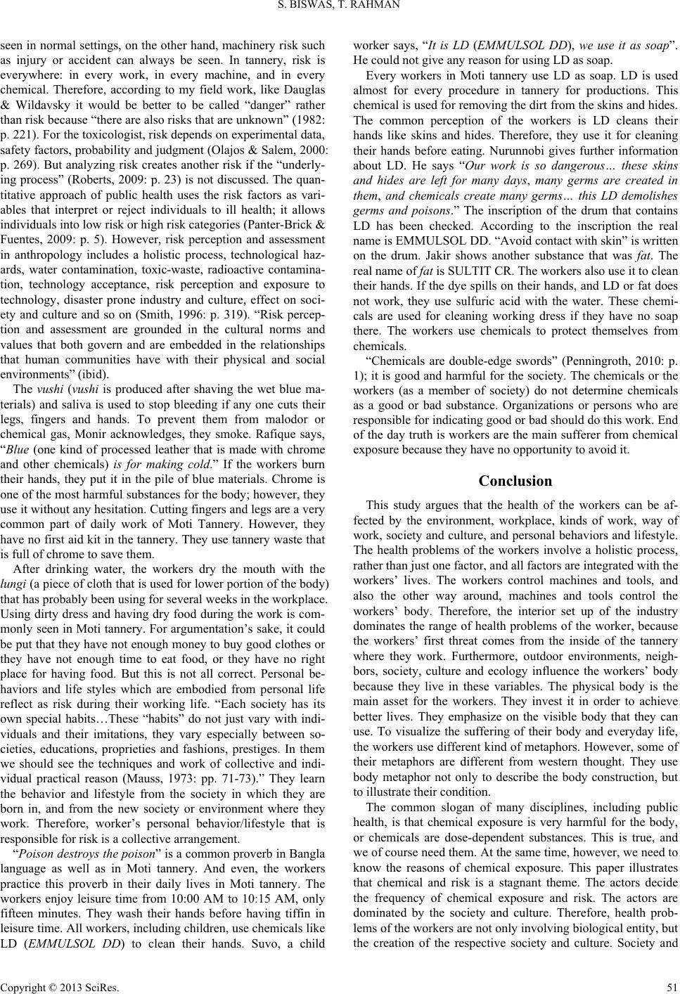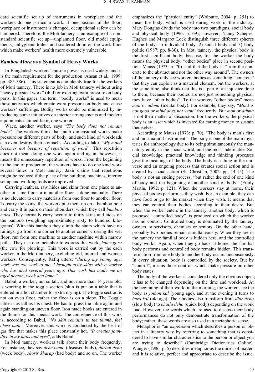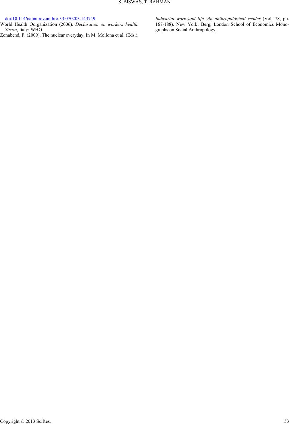 S. BISWAS, T. RAHMAN Copyright © 2013 SciRes. 53 doi:10.1146/annurev.anthro.33.070203.143749 World Health Oorganization (2006). Declaration on workers health. Stresa, Italy: WHO. Zonabend, F. (2009) . The nuclear everyday. In M. Mollona et al. (Eds.), Industrial work and life. An anthropological reader (Vol. 78, pp. 167-188). New York: Berg, London School of Economics Mono- graphs on Social Anthropology.
