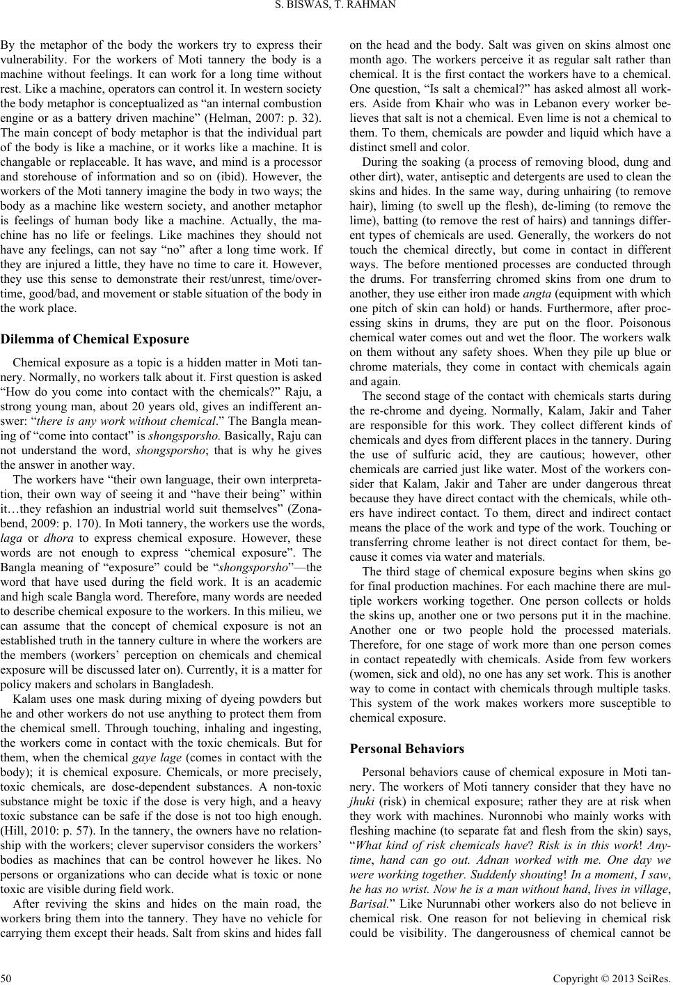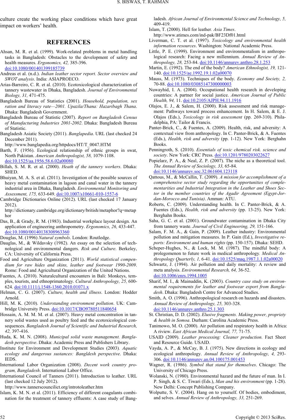 S. BISWAS, T. RAHMAN culture create the working place conditions which have great impact on workers’ health. REFERENCES Ahsan, M. R. et al. (1999). Work-related problems in metal handling tasks in Bangladesh: Obstacles to the development of safety and health measures. Ergonomics, 42, 385-396. doi:10.1080/001401399185739 Andreas et al. (n.d.). Indian leather sector report. Sector overview and SWOT analysis. India: ASIAPROECO. Arias-Barreiro, C. R. et al. (2010). Ecotoxicological characterization of tannery wastewater in Dhaka, Bangladesh. Journal of Environmental Biology, 31, 471-475. Bangladesh Bureau of Statistics (2001). Household, population, sex ration and literacy rate—2001. Upazila/Thana: Hazaribagh Thana. Dhaka: Bangladesh Government. Bangladesh Bureau of Statistic (2007). Report on Bangladesh Census of Manufacturing Industries 2001-2002. Dhaka: Bangladesh Bureau of Statistic. Bangladesh Asiatic Society (2011). Banglapedia. URL (last checked 24 December 2011). http://www.banglapedia.org/httpdocs/HT/T_0047.HTM Barth, F. (1956). Ecological relationship of ethnic groups in swat, North Pakistan. American Anthropologist, 58, 1079-1108. doi:10.1525/aa.1956.58.6.02a00080 Billah, S. M. R. et al. (2000). Heath of the tannery workers. Dhaka: SHED. Bhuiyan, M. A. S. et al. (2011). Investigation of the possible sources of heavy metal contamination in lagoon and canal water in the tannery industrial area in Dhaka, Bangladesh. Environmental Monitoring and Assessment, 175, 633-649. doi:10.1007/s10661-010-1557-6 Cambridge Dictionaries Online (2012). URL (last checked 17 January 2012). http://dictionary.cambridge.org/dictionary/british/metaphor?q=metap hor Das, B., & Grady, R. M. (1983). Industrial workplace layout design. An application of engineer in g a n t hropometry. Ergonomics, 26, 433-447. doi:10.1080/00140138308963360 Douglas, M. (1996) Natural symbols. London: Routledg e . Dauglas, M., & Wildavsky (1982). An essay on the selection of tech- nological and environmental dangers. Risk and Culture. Berkeley, CA: University of California Press. Food and Agriculture Organization (2011). World statistical compen- dium for raw hides and skins, leather and footwear 1990-2009. Rome: Food and Agricultural Organization of the Unit ed Nations. Fuentes, A. (2010). Naturalcultural encounters in Bali: Monkeys, tem- ples, tourists, and ethnoprimatology. Cultural Anthropology, 25, 600- 624. doi:10.1111/j.1548-1360.2010.01071.x Helman, C. G. (2007). Culture, health and illness. London: Hodder Arnold. Hill, M. K. (2010). Understanding environment pollution. UK: Cam- bridge University Press. doi:10.1017/CBO9780511840654 Hossain, A. M. M. M. et al. (2007). Heavy metal concentration in tan- nery solid wastes used as poultry feed and the ecotoxicological con- sequences. Bangladesh Journal of Scientific and Industrial Research, 42, 397-416. Huda, K. M. N. (2008). Municipal solid waste management. Bangla- desh perspective. Dhaka: Academic Pre s s a nd P u b l i s h ers Library. Institute for Environment and Development Studies (2003). Aquatic ecology and dangerous sustances: Bangldesh perspective. Dhaka: IEDS. International Labor Organization (2008). Decent work country pro- gram, Bangladesh. Int ernational Labor Office. International Council of Tanners (2011). Introduction to leather. URL (last checked 12 July 201 2 ). http://www.tannerscouncilict.org/introtoleather.htm Islam, K. M. N. et al. (2011). Efficiency of different coagulants combi- nation for the treatment of tannery effluents: A case study of Bang- ladesh. African Journal of Environmental Science and Techn ology, 5, 409-419. Islam, T. ( 20 00 ). Hell for leather. Asia Times. http://www.atimes.com/ind-pak/BF23Df01.html Liverman, C. T. et al. (1997). Toxicology and environmental health information resources. Washington: Nat ion al Aca dem ic Press. Little, P. E. (1999). Environment and environmentalism in anthropo- logical research: Facing a new millennium. Annual Review of An- thropology, 28, 253-84. doi:10.1146/annurev.anthro.28.1.253 Martin, E. (1992). The end of the body? American Ethnologist, 19, 121- 140. doi:10.1525/ae.1992.19.1.02a00070 Mauss, M. (1973). Techniques of the body. Economy and Society, 2, 70-88. doi:10.1080/03085147300000003 Nuwayhid, I. A. (2004). Occupational health research in developing countries: A partner for social justice. American Journal of Public Health, 94, 11. doi:10.2105/AJPH.94.11.1916 Olajos, E. J., & Salem, H. (2000). Risk assessment and risk manage- ment: Pathways toward process enhancement. In H. Salem, & E. J. Olajos (Eds.), Toxicology in risk assessment (pp. 269-310). Phila- delphia, PA: Tailor & Francis. Panter-Brick, C., & Fuentes, A. (2009). Health, risk, and adversity: A contextual view from anthr o po l og y. In C. Panter- Brick, & A. Fuentes (Eds.), Health, risk and adversity (pp. 1-12). New York: Berghahn Books. Penningroth, S. (2010). Essentials of toxic chemical risk. science and society. New York: CRC Press. doi:10.1201/9780203022627 Popielarz, P. A., & Neal, Z. P. (2007). The niche as a theoretical tool. The Annual Review of Sociology, 33, 65-84. doi:10.1146/annurev.soc.32.061604.123118 Qattous, M., & McCallin, T. (2009). A mission for accomplishment of a comprehensive sector study regarding the opportunities of comple- mentarities and Industrial Integration in the Leather and Shoes Sec- tor in the member countries of the Agadir Agreement (Egypt-Jor- dan-Morocco and Tunisia). Amman: ATU. Roberts, C. (2009). Understanding health. In C. Panter-Brick, & A. Fuentes (Eds.), Health, risk and adversity (pp. 13-25). New York: Berghahn Books. Saha, G. C. et al. (2001). Groundwater contamination in Dhaka City from tannery waste. Journal of Civil Engineering, 29 , 151-166. Salam, F. M. A., & Gain, P. (2009). Leather industry: Environmental pollution and mitigation measures. In P. Gain (Ed.), Investigative re- ports: Environment and human r i ghts (pp. 150-157). Dhaka: SEHD. Scheper-Hughes, N., & Lock, M. M. (1