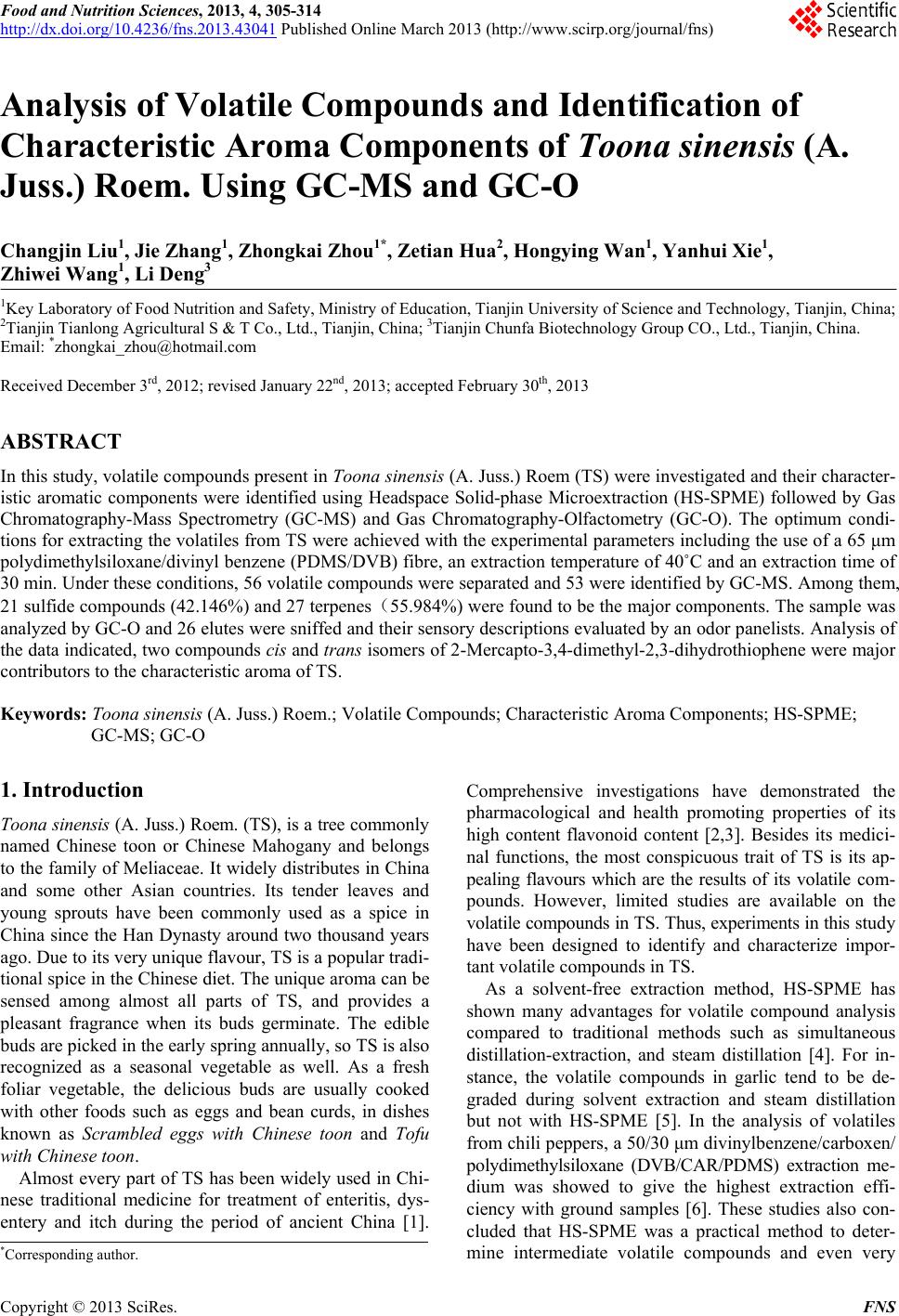 Food and Nutrition Sciences, 2013, 4, 305-314 http://dx.doi.org/10.4236/fns.2013.43041 Published Online March 2013 (http://www.scirp.org/journal/fns) Analysis of Volatile Compounds and Identification of Characteristic Aroma Components of Toona sinensis (A. Juss.) Roem. Using GC-MS and GC-O Changjin Liu1, Jie Zhang1, Zhongkai Zhou1*, Zetian Hua2, Hongying Wan1, Yanhui Xie1, Zhiwei Wang1, Li Deng3 1Key Laboratory of Food Nutrition and Safety, Ministry of Education, Tianjin University of Science and Technology, Tianjin, China; 2Tianjin Tianlong Agricultural S & T Co., Ltd., Tianjin, China; 3Tianjin Chunfa Biotechnology Group CO., Ltd., Tianjin, China. Email: *zhongkai_zhou@hotmail.com Received December 3rd, 2012; revised January 22nd, 2013; accepted February 30th, 2013 ABSTRACT In this study, volatile compounds present in Toona sinensis (A. Juss.) Roem (TS) were investigated and their character- istic aromatic components were identified using Headspace Solid-phase Microextraction (HS-SPME) followed by Gas Chromatography-Mass Spectrometry (GC-MS) and Gas Chromatography-Olfactometry (GC-O). The optimum condi- tions for extracting the volatiles from TS were achieved with the experimental parameters including the use of a 65 μm polydimethylsiloxane/divinyl benzene (PDMS/DVB) fibre, an extraction temperature of 40˚C and an extraction time of 30 min. Under these conditions, 56 volatile compounds were separated and 53 were identified by GC-MS. Among them, 21 sulfide compounds (42.146%) and 27 terpenes(55.984%) were found to be the major components. The sample was analyzed by GC-O and 26 elutes were sniffed and their sensory descriptions evaluated by an odor panelists. Analysis of the data indicated, two compounds cis and trans isomers of 2-Mercapto-3,4-dimethyl-2,3-dihydrothiophene were major contributors to the characteristic aroma of TS. Keywords: Toona sinensis (A. Juss.) Roem.; Volatile Compounds; Characteristic Aroma Components; HS-SPME; GC-MS; GC-O 1. Introduction Toona sinensis (A. Juss.) Roem. (TS), is a tree commonly named Chinese toon or Chinese Mahogany and belongs to the family of Meliaceae. It widely distributes in China and some other Asian countries. Its tender leaves and young sprouts have been commonly used as a spice in China since the Han Dynasty around two thousand years ago. Due to its very unique flavour, TS is a popular tradi- tional spice in the Chinese diet. The unique aroma can be sensed among almost all parts of TS, and provides a pleasant fragrance when its buds germinate. The edible buds are picked in the early spring annually, so TS is also recognized as a seasonal vegetable as well. As a fresh foliar vegetable, the delicious buds are usually cooked with other foods such as eggs and bean curds, in dishes known as Scrambled eggs with Chinese to on and Tofu with Chinese toon. Almost every part of TS has been widely used in Chi- nese traditional medicine for treatment of enteritis, dys- entery and itch during the period of ancient China [1]. Comprehensive investigations have demonstrated the pharmacological and health promoting properties of its high content flavonoid content [2,3]. Besides its medici- nal functions, the most conspicuous trait of TS is its ap- pealing flavours which are the results of its volatile com- pounds. However, limited studies are available on the volatile compounds in TS. Thus, experiments in this study have been designed to identify and characterize impor- tant volatile compounds in TS. As a solvent-free extraction method, HS-SPME has shown many advantages for volatile compound analysis compared to traditional methods such as simultaneous distillation-extraction, and steam distillation [4]. For in- stance, the volatile compounds in garlic tend to be de- graded during solvent extraction and steam distillation but not with HS-SPME [5]. In the analysis of volatiles from chili peppers, a 50/30 μm divinylbenzene/carboxen/ polydimethylsiloxane (DVB/CAR/PDMS) extraction me- dium was showed to give the highest extraction effi- ciency with ground samples [6]. These studies also con- cluded that HS-SPME was a practical method to deter- mine intermediate volatile compounds and even very *Corresponding author. Copyright © 2013 SciRes. FNS