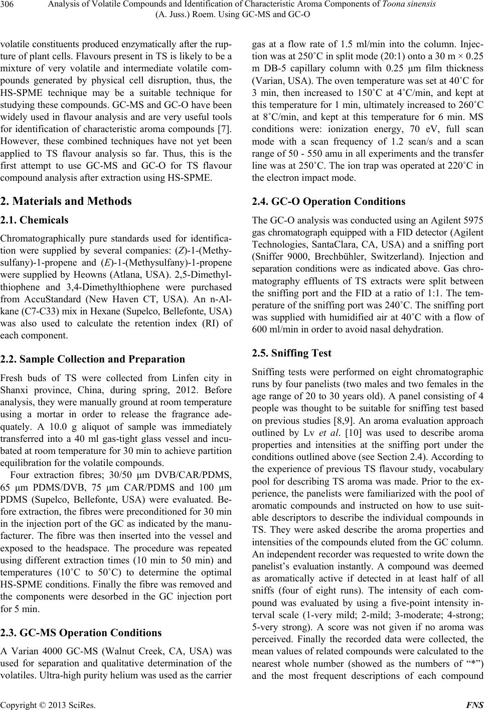 Analysis of Volatile Compounds and Identification of Characteristic Aroma Components of Toona sinensis (A. Juss.) Roem. Using GC-MS and GC-O 306 volatile constituents produced enzymatically after the rup- ture of plant cells. Flavours present in TS is likely to be a mixture of very volatile and intermediate volatile com- pounds generated by physical cell disruption, thus, the HS-SPME technique may be a suitable technique for studying these compounds. GC-MS and GC-O have been widely used in flavour analysis and are very useful tools for identification of characteristic aroma compounds [7]. However, these combined techniques have not yet been applied to TS flavour analysis so far. Thus, this is the first attempt to use GC-MS and GC-O for TS flavour compound analysis after extraction using HS-SPME. 2. Materials and Methods 2.1. Chemicals Chromatographically pure standards used for identifica- tion were supplied by several companies: (Z)-1-(Methy- sulfany)-1-propene and (E)-1-(Methysulfany)-1-propene were supplied by Heowns (Atlana, USA). 2,5-Dimethyl- thiophene and 3,4-Dimethylthiophene were purchased from AccuStandard (New Haven CT, USA). An n-Al- kane (C7-C33) mix in Hexane (Supelco, Bellefonte, USA) was also used to calculate the retention index (RI) of each component. 2.2. Sample Collection and Preparation Fresh buds of TS were collected from Linfen city in Shanxi province, China, during spring, 2012. Before analysis, they were manually ground at room temperature using a mortar in order to release the fragrance ade- quately. A 10.0 g aliquot of sample was immediately transferred into a 40 ml gas-tight glass vessel and incu- bated at room temperature for 30 min to achieve partition equilibration for the volatile compounds. Four extraction fibres; 30/50 μm DVB/CAR/PDMS, 65 μm PDMS/DVB, 75 μm CAR/PDMS and 100 μm PDMS (Supelco, Bellefonte, USA) were evaluated. Be- fore extraction, the fibres were preconditioned for 30 min in the injection port of the GC as indicated by the manu- facturer. The fibre was then inserted into the vessel and exposed to the headspace. The procedure was repeated using different extraction times (10 min to 50 min) and temperatures (10˚C to 50˚C) to determine the optimal HS-SPME conditions. Finally the fibre was removed and the components were desorbed in the GC injection port for 5 min. 2.3. GC-MS Operation Conditions A Varian 4000 GC-MS (Walnut Creek, CA, USA) was used for separation and qualitative determination of the volatiles. Ultra-high purity helium was used as the carrier gas at a flow rate of 1.5 ml/min into the column. Injec- tion was at 250˚C in split mode (20:1) onto a 30 m × 0.25 m DB-5 capillary column with 0.25 μm film thickness (Varian, USA). The oven temperature was set at 40˚C for 3 min, then increased to 150˚C at 4˚C/min, and kept at this temperature for 1 min, ultimately increased to 260˚C at 8˚C/min, and kept at this temperature for 6 min. MS conditions were: ionization energy, 70 eV, full scan mode with a scan frequency of 1.2 scan/s and a scan range of 50 - 550 amu in all experiments and the transfer line was at 250˚C. The ion trap was operated at 220˚C in the electron impact mode. 2.4. GC-O Operation Conditions The GC-O analysis was conducted using an Agilent 5975 gas chromatograph equipped with a FID detector (Agilent Technologies, SantaClara, CA, USA) and a sniffing port (Sniffer 9000, Brechbühler, Switzerland). Injection and separation conditions were as indicated above. Gas chro- matography effluents of TS extracts were split between the sniffing port and the FID at a ratio of 1:1. The tem- perature of the sniffing port was 240˚C. The sniffing port was supplied with humidified air at 40˚C with a flow of 600 ml/min in order to avoid nasal dehydration. 2.5. Sniffing Test Sniffing tests were performed on eight chromatographic runs by four panelists (two males and two females in the age range of 20 to 30 years old). A panel consisting of 4 people was thought to be suitable for sniffing test based on previous studies [8,9]. An aroma evaluation approach outlined by Lv et al. [10] was used to describe aroma properties and intensities at the sniffing port under the conditions outlined above (see Section 2.4). According to the experience of previous TS flavour study, vocabulary pool for describing TS aroma was made. Prior to the ex- perience, the panelists were familiarized with the pool of aromatic compounds and instructed on how to use suit- able descriptors to describe the individual compounds in TS. They were asked describe the aroma properties and intensities of the compounds eluted from the GC column. An independent recorder was requested to write down the panelist’s evaluation instantly. A compound was deemed as aromatically active if detected in at least half of all sniffs (four of eight runs). The intensity of each com- pound was evaluated by using a five-point intensity in- terval scale (1-very mild; 2-mild; 3-moderate; 4-strong; 5-very strong). A score was not given if no aroma was perceived. Finally the recorded data were collected, the mean values of related compounds were calculated to the nearest whole number (showed as the numbers of “*”) and the most frequent descriptions of each compound Copyright © 2013 SciRes. FNS