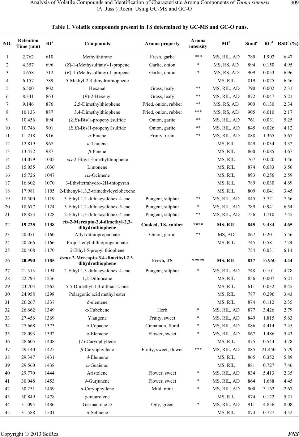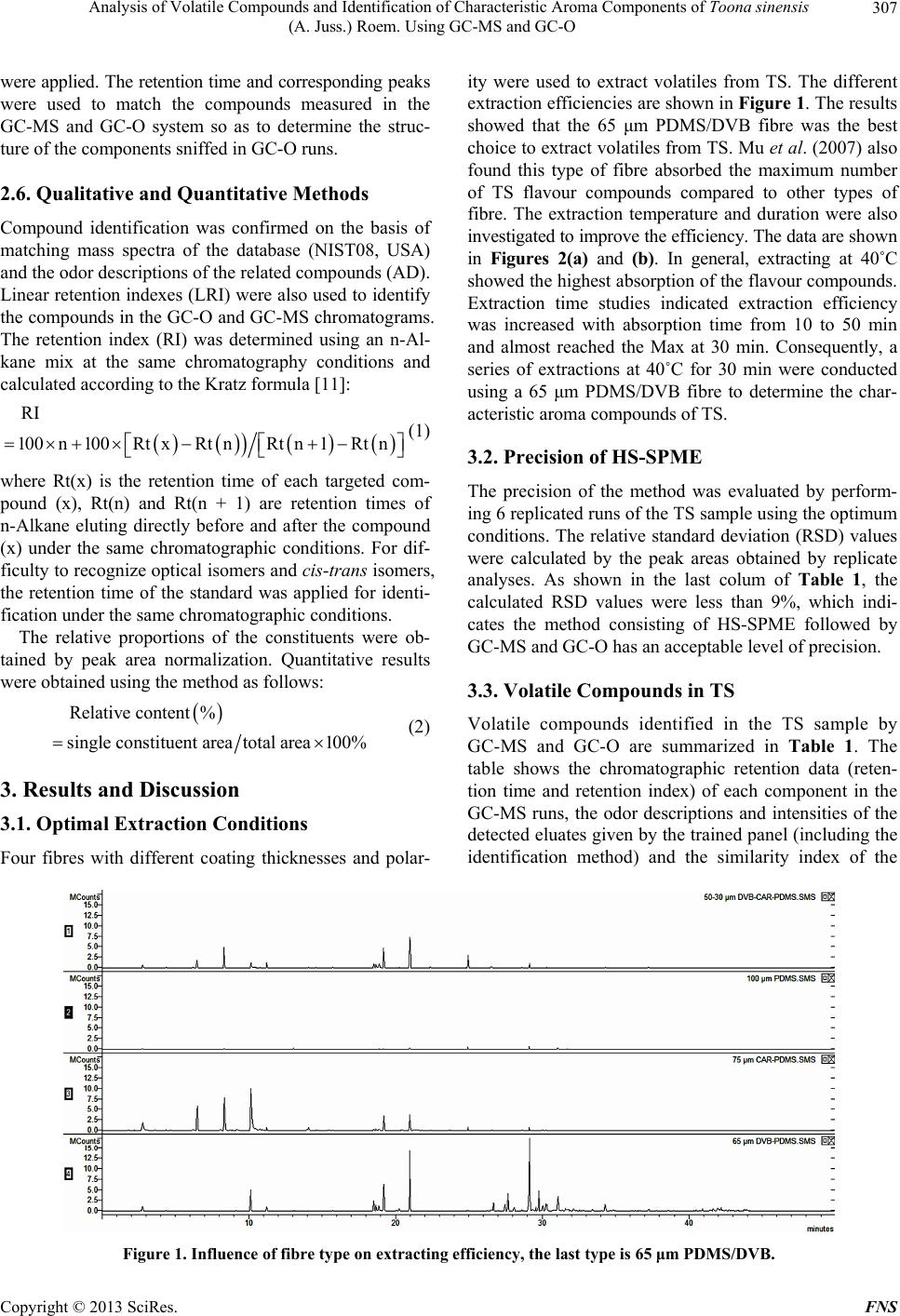 Analysis of Volatile Compounds and Identification of Characteristic Aroma Components of Toona sinensis (A. Juss.) Roem. Using GC-MS and GC-O Copyright © 2013 SciRes. FNS 307 were applied. The retention time and corresponding peaks were used to match the compounds measured in the GC-MS and GC-O system so as to determine the struc- ture of the components sniffed in GC-O runs. 2.6. Qualitative and Quantitative Methods Compound identification was confirmed on the basis of matching mass spectra of the database (NIST08, USA) and the odor descriptions of the related compounds (AD). Linear retention indexes (LRI) were also used to identify the compounds in the GC-O and GC-MS chromatograms. The retention index (RI) was determined using an n-Al- kane mix at the same chromatography conditions and calculated according to the Kratz formula [11]: RI 100n100Rt xRt nRt n1Rt n (1) ity were used to extract volatiles from TS. The different extraction efficiencies are shown in Figure 1. The results showed that the 65 μm PDMS/DVB fibre was the best choice to extract volatiles from TS. Mu et al. (2007) also found this type of fibre absorbed the maximum number of TS flavour compounds compared to other types of fibre. The extraction temperature and duration were also investigated to improve the efficiency. The data are shown in Figures 2(a) and (b). In general, extracting at 40˚C showed the highest absorption of the flavour compounds. Extraction time studies indicated extraction efficiency was increased with absorption time from 10 to 50 min and almost reached the Max at 30 min. Consequently, a series of extractions at 40˚C for 30 min were conducted using a 65 μm PDMS/DVB fibre to determine the char- acteristic aroma compounds of TS. 3.2. Precision of HS-SPME where Rt(x) is the retention time of each targeted com- pound (x), Rt(n) and Rt(n + 1) are retention times of n-Alkane eluting directly before and after the compound (x) under the same chromatographic conditions. For dif- ficulty to recognize optical isomers and cis-trans isomers, the retention time of the standard was applied for identi- fication under the same chromatographic conditions. The precision of the method was evaluated by perform- ing 6 replicated runs of the TS sample using the optimum conditions. The relative standard deviation (RSD) values were calculated by the peak areas obtained by replicate analyses. As shown in the last colum of Table 1, the calculated RSD values were less than 9%, which indi- cates the method consisting of HS-SPME followed by GC-MS and GC-O has an acceptable level of precision. The relative proportions of the constituents were ob- tained by peak area normalization. Quantitative results were obtained using the method as follows: 3.3. Volatile Compounds in TS Relative content% single constituent areatotal area100% (2) Volatile compounds identified in the TS sample by GC-MS and GC-O are summarized in Table 1. The table shows the chromatographic retention data (reten- tion time and retention index) of each component in the GC-MS runs, the odor descriptions and intensities of the detected eluates given by the trained panel (including the identification method) and the similarity index of the 3. Results and Discussion 3.1. Optimal Extraction Conditions Four fibres with different coating thicknesses and polar- Figure 1. Influence of fibre type on extracting efficiency, the last type is 65 μm PDMS/DVB.