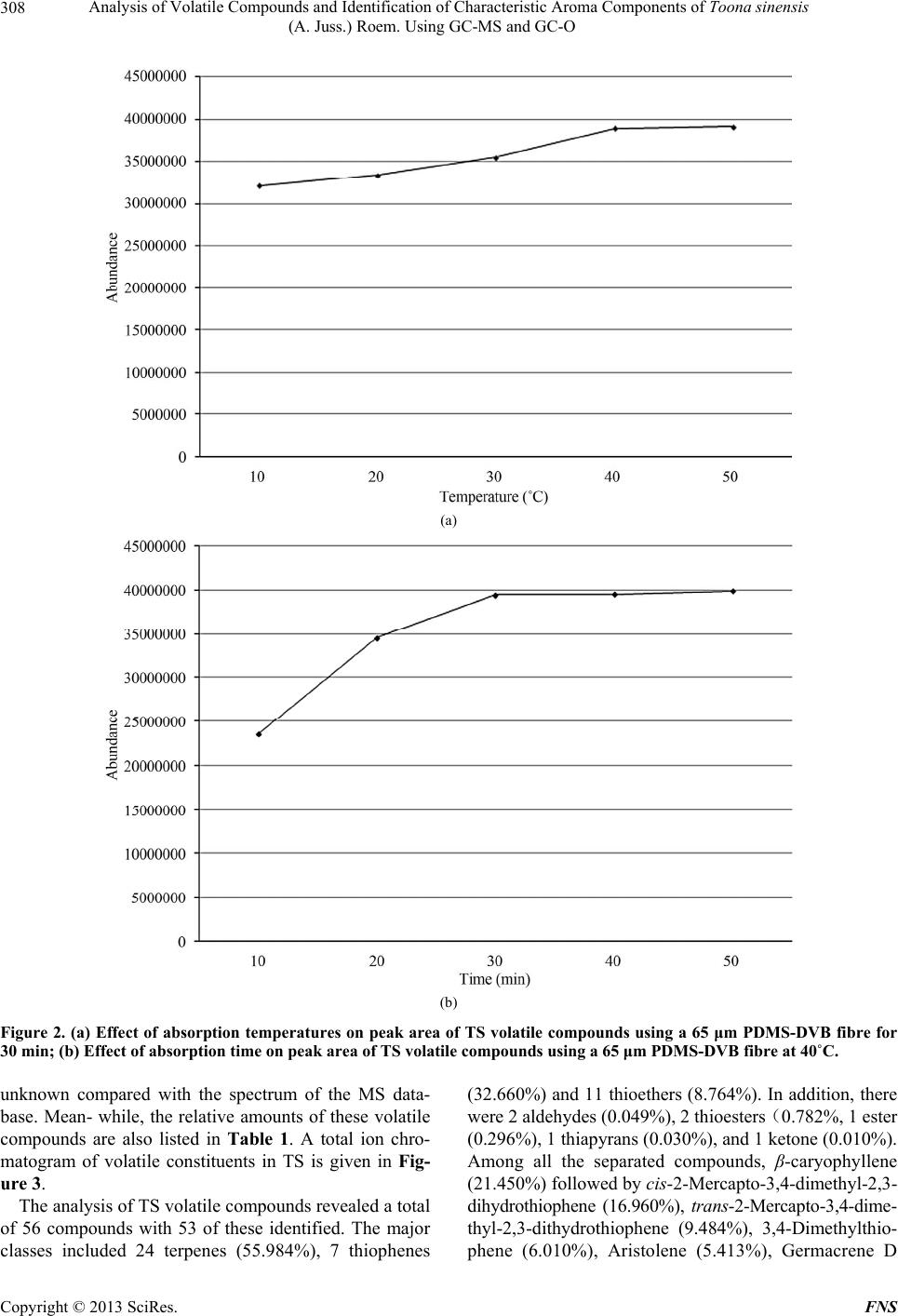 Analysis of Volatile Compounds and Identification of Characteristic Aroma Components of Toona sinensis (A. Juss.) Roem. Using GC-MS and GC-O 308 (a) (b) Figure 2. (a) Effect of absorption temperatures on peak area of TS volatile compounds using a 65 μm PDMS-DVB fibre for 30 min; (b) Effect of absorption time on peak area of TS volatile compounds using a 65 μm PDMS-DVB fibre at 40˚C. unknown compared with the spectrum of the MS data- base. Mean- while, the relative amounts of these volatile compounds are also listed in Table 1. A total ion chro- matogram of volatile constituents in TS is given in Fig- ure 3. The analysis of TS volatile compounds revealed a total of 56 compounds with 53 of these identified. The major classes included 24 terpenes (55.984%), 7 thiophenes (32.660%) and 11 thioethers (8.764%). In addition, there were 2 aldehydes (0.049%), 2 thioesters (0.782%, 1 ester (0.296%), 1 thiapyrans (0.030%), and 1 ketone (0.010%). Among all the separated compounds, β-caryophyllene (21.450%) followed by cis-2-Mercapto-3,4-dimethyl-2,3- dihydrothiophene (16.960%), trans-2-Mercapto-3,4-dime- thyl-2,3-dithydrothiophene (9.484%), 3,4-Dimethylthio- phene (6.010%), Aristolene (5.413%), Germacrene D Copyright © 2013 SciRes. FNS