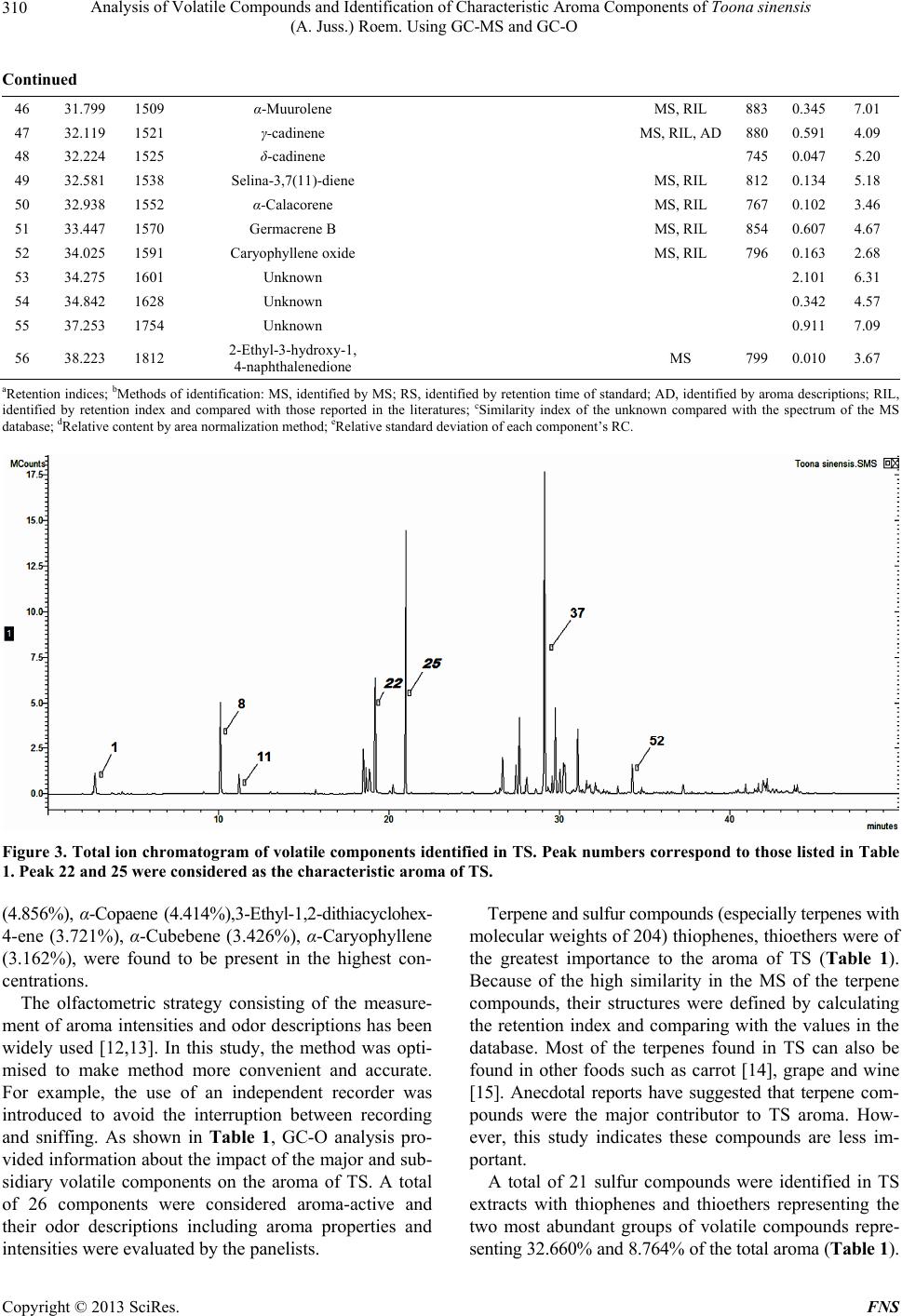 Analysis of Volatile Compounds and Identification of Characteristic Aroma Components of Toona sinensis (A. Juss.) Roem. Using GC-MS and GC-O 310 Continued 46 31.799 1509 α-Muurolene MS, RIL 883 0.3457.01 47 32.119 1521 γ-cadinene MS, RIL, AD 880 0.5914.09 48 32.224 1525 δ-cadinene 745 0.0475.20 49 32.581 1538 Selina-3,7(11)-diene MS, RIL 812 0.1345.18 50 32.938 1552 α-Calacorene MS, RIL 767 0.1023.46 51 33.447 1570 Germacrene B MS, RIL 854 0.6074.67 52 34.025 1591 Caryophyllene oxide MS, RIL 796 0.1632.68 53 34.275 1601 Unknown 2.1016.31 54 34.842 1628 Unknown 0.3424.57 55 37.253 1754 Unknown 0.9117.09 56 38.223 1812 2-Ethyl-3-hydroxy-1, 4-naphthalenedione MS 799 0.0103.67 aRetention indices; bMethods of identification: MS, identified by MS; RS, identified by retention time of standard; AD, identified by aroma descriptions; RIL, identified by retention index and compared with those reported in the literatures; cSimilarity index of the unknown compared with the spectrum of the MS database; dRelative content by area normalization method; eRelative standard deviation of each component’s RC. Figure 3. Total ion chromatogram of volatile components identified in TS. Peak numbers correspond to those listed in Table 1. Peak 22 and 25 were considered as the characteristic aroma of TS. (4.856%), α-Copaene (4.414%),3-Ethyl-1,2-dithiacyclohex- 4-ene (3.721%), α-Cubebene (3.426%), α-Caryophyllene (3.162%), were found to be present in the highest con- centrations. The olfactometric strategy consisting of the measure- ment of aroma intensities and odor descriptions has been widely used [12,13]. In this study, the method was opti- mised to make method more convenient and accurate. For example, the use of an independent recorder was introduced to avoid the interruption between recording and sniffing. As shown in Table 1, GC-O analysis pro- vided information about the impact of the major and sub- sidiary volatile components on the aroma of TS. A total of 26 components were considered aroma-active and their odor descriptions including aroma properties and intensities were evaluated by the panelists. Terpene and sulfur compounds (especially terpenes with molecular weights of 204) thiophenes, thioethers were of the greatest importance to the aroma of TS (Table 1). Because of the high similarity in the MS of the terpene compounds, their structures were defined by calculating the retention index and comparing with the values in the database. Most of the terpenes found in TS can also be found in other foods such as carrot [14], grape and wine [15]. Anecdotal reports have suggested that terpene com- pounds were the major contributor to TS aroma. How- ever, this study indicates these compounds are less im- portant. A total of 21 sulfur compounds were identified in TS extracts with thiophenes and thioethers representing the two most abundant groups of volatile compounds repre- senting 32.660% and 8.764% of the total aroma (Table 1). Copyright © 2013 SciRes. FNS
