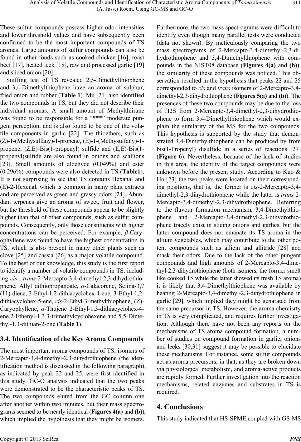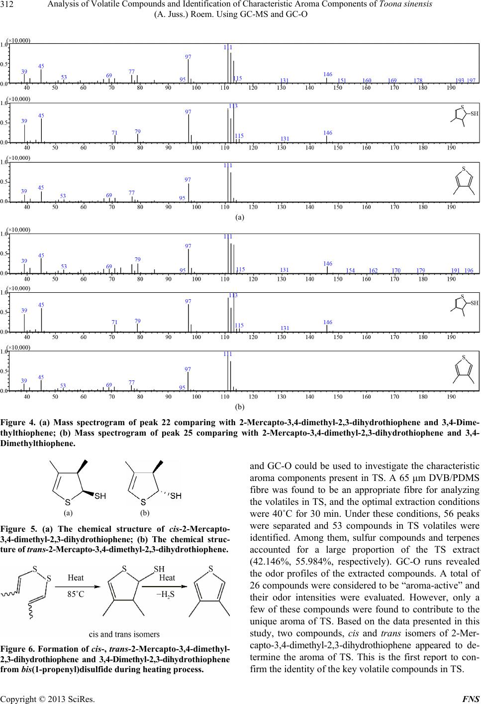 Analysis of Volatile Compounds and Identification of Characteristic Aroma Components of Toona sinensis (A. Juss.) Roem. Using GC-MS and GC-O Copyright © 2013 SciRes. FNS 312 (a) (b) Figure 4. (a) Mass spectrogram of peak 22 comparing with 2-Mercapto-3,4-dimethyl-2,3-dihydrothiophene and 3,4-Dime- thylthiophene; (b) Mass spectrogram of peak 25 comparing with 2-Mercapto-3,4-dimethyl-2,3-dihydrothiophene and 3,4- Dimethylthiophene. and GC-O could be used to investigate the characteristic aroma components present in TS. A 65 μm DVB/PDMS fibre was found to be an appropriate fibre for analyzing the volatiles in TS, and the optimal extraction conditions were 40˚C for 30 min. Under these conditions, 56 peaks were separated and 53 compounds in TS volatiles were identified. Among them, sulfur compounds and terpenes accounted for a large proportion of the TS extract (42.146%, 55.984%, respectively). GC-O runs revealed the odor profiles of the extracted compounds. A total of 26 compounds were considered to be “aroma-active” and their odor intensities were evaluated. However, only a few of these compounds were found to contribute to the unique aroma of TS. Based on the data presented in this study, two compounds, cis and trans isomers of 2-Mer- capto-3,4-dimethyl-2,3-dihydrothiophene appeared to de- termine the aroma of TS. This is the first report to con- firm the identity of the key volatile compounds in TS. (a) (b) Figure 5. (a) The chemical structure of cis-2-Mercapto- 3,4-dimethyl-2,3-dihydrothiophene; (b) The chemical struc- ture of trans-2-Mercapto-3,4-dimethyl-2,3-dihydrothiophene. Figure 6. Formation of cis-, trans-2-Mercapto-3,4-dimethyl- 2,3-dihydrothiophene and 3,4-Dimethyl-2,3-dihydrothiophene from bis(1-propenyl)disulfide during heating process.