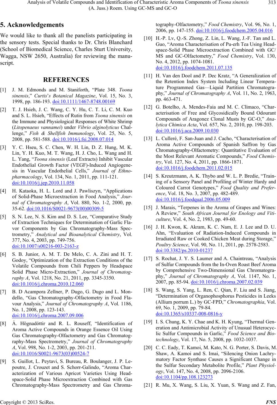 Analysis of Volatile Compounds and Identification of Characteristic Aroma Components of Toona sinensis (A. Juss.) Roem. Using GC-MS and GC-O 313 5. Acknowledgements We would like to thank all the panelists participating in the sensory tests. Special thanks to Dr. Chris Blanchard (School of Biomedical Science, Charles Sturt University, Wagga, NSW 2650, Australia) for reviewing the manu- script. REFERENCES [1] J. M. Edmonds and M. Staniforth, “Plate 348. Toona sinensis,” Curtis’s Botanical Magazine, Vol. 15, No. 3, 1998, pp. 186-193. doi:10.1111/1467-8748.00169 [2] T. J. Hsieh, J. C. Wang, C. Y. Hu, C. T. Li, C. M. Kuo and S. L. Hsieh, “Effects of Rutin from Toona sinensis on the Immune and Physiological Responses of White Shrimp (Litopenaeus vannamei) under Vibrio alginolyticus Chal- lenge,” Fish & Shellfish Immunology, Vol. 25, No. 5, 2008, pp. 581-588. doi:10.1016/j.fsi.2008.07.014 [3] Y. C. Hseu, S. C. Chen, W. H. Lin, D. Z. Hung, M. K. Lin, Y. H. Kuo, M. T. Wang, H. J. Cho, L. Wang and H. L. Yang, “Toona sinensis (Leaf Extracts) Inhibit Vascular Endothelial Growth Factor (VEGF)-Induced Angiogene- sis in Vascular Endothelial Cells,” Journal of Ethno- pharmacology, Vol. 134, No. 1, 2011, pp. 111-121. doi:10.1016/j.jep.2010.11.058 [4] H. Kataoka, H. L. Lord and J. Pawliszyn, “Applications of Solid-Phase Microextraction in Food Analysis,” Jour- nal of Chromatography A, Vol. 880, No. 1-2, 2000, pp. 35-62. doi:10.1016/S0021-9673(00)00309-5 [5] S. N. Lee, N. S. Kim and D. S. Lee, “Comparative Study of Extraction Techniques for Determination of Garlic Fla- vor Components by Gas Chromatography-Mass Spec- trometry,” Analytical and Bioanalytical Chemistry, Vol. 377, No. 4, 2003, pp. 749-756. doi:10.1007/s00216-003-2163-z [6] S. B. Junior, A. M. T. De Melo, C. A. Zini and H. T. Godoy, “Optimization of the Extraction Conditions of the Volatile Compounds from Chili Peppers by Headspace Solid Phase Micro-Extraction,” Journal of Chromatog- raphy A, Vol. 1218, No. 21, 2011, pp. 3345-3350. doi:10.1016/j.chroma.2010.12.060 [7] B. D Acampora Zellner, P. Dugo, G. Dugo and L. Mon- dello, “Gas Chromatography-Olfactometry in Food Fla- vour Analysis,” Journal of Chromatography A, Vol. 1186, No. 1, 2008, pp. 123-143. doi:10.1016/j.chroma.2007.09.006 [8] Á. Högnadóttir and R. L. Rouseff, “Identification of Aroma Active Compounds in Orange Essence Oil Using Gas Chromatography-Olfactometry and Gas Chromatog- raphy-Mass Spectrometry,” Journal of Chromatography A, Vol. 998, No. 1-2, 2003, pp. 201-211. doi:10.1016/S0021-9673(03)00524-7 [9] S. Guillot, L. Peytavi, S. Bureau, R. Boulanger, J. P. Le- poutre, J. Crouzet and S. Schorr-Galindo, “Aroma Char- acterization of Various Apricot Varieties Using Head- space-Solid Phase Microextraction Combined with Gas Chromatography-Mass Spectrometry and Gas Chroma- tography-Olfactometry,” Food Chemistry, Vol. 96, No. 1, 2006, pp. 147-155. doi:10.1016/j.foodchem.2005.04.016 [10] H.-P. Lv, Q.-S. Zhong, Z. Lin, L. Wang, J.-F. Tan and L. Guo, “Aroma Characterisation of Pu-erh Tea Using Head- space-Solid Phase Microextraction Combined with GC/ MS and GC-Olfactometry,” Food Chemistry, Vol. 130, No. 4, 2012, pp. 1074-1081. doi:10.1016/j.foodchem.2011.07.135 [11] H. Van den Dool and P. Dec Kratz, “A Generalization of the Retention Index System Including Linear Tempera- ture Programmed Gas—Liquid Partition Chromatogra- phy,” Journal of Chromatography A, Vol. 11, No. 2, 1963, pp. 463-471. [12] G. Botelho, A. Mendes-Faia and M. C. Clímaco, “Char- acterisation of Free and Glycosidically Bound Odourant Compounds of Aragonez Clonal Musts by GC-O,” Ana- lytica Chimica Acta, Vol. 657, No. 2, 2010, pp. 198-203. doi:10.1016/j.aca.2009.10.030 [13] L. Culleré, F. San-Juan and J. Cacho, “Characterisation of Aroma Active Compounds of Spanish Saffron by Gas Chromatography-Olfactometry: Quantitative Evaluation of the Most Relevant Aromatic Compounds,” Food Chemis- try, Vol. 127, No. 4, 2011, pp. 1866-1871. doi:10.1016/j.foodchem.2011.02.015 [14] S. Kreutzmann, A. K. Thybo and W. L. P. Bredie, “Train- ing of a Sensory Panel and Profiling of Winter Hardy and Coloured Carrot Genotypes,” Food Quality and Prefer- ence, Vol. 18, No. 3, 2007, pp. 482-489. doi:10.1016/j.foodqual.2006.05.009 [15] J. Marais, “Terpenes in the Aroma of Grapes and Wines: A Review,” South African Journal for Enology and Viti- culture, Vol. 4, No. 2, 1983, pp. 49-60. [16] J. H. Kwon, K. Akram, K. C. Nam, E. J. Lee and D. U. Ahn, “Evaluation of Radiation-Induced Compounds in Irradiated Raw or Cooked Chicken Meat during Storage,” Poultry Science, Vol. 90, No. 11, 2011, pp. 2578-2583. doi:10.3382/ps.2010-01237 [17] S. Rochat, J. Y. S. Laumer and A. Chaintreau, “Analysis of Sulfur Compounds from the In-Oven Roast Beef Aroma by Comprehensive Two-Dimensional Gas Chromatogra- phy,” Journal of Chromatography A, Vol. 1147, No. 1, 2007, pp. 85-94. doi:10.1016/j.chroma.2007.02.039 [18] S. Wang, S. Yang, L. Ren, C. Qian, F. Liu and S. Jiang, “Determination of Organophosphorus Pesticides in Leeks (Allium porrum L.) by GC-FPD,” Chromatographia, Vol. 69, No. 1, 2009, pp. 79-84. doi:10.1365/s10337-008-0816-y [19] I. S. Chung, K. Y. Chae and K. H. Kyung, “Thermal Gen- eration and Antimicrobial Activity of Unusual Heterocyc- lic Sulfur Compounds in Garlic,” Food Science and Bio- technology, Vol. 17, No. 5, 2008, pp. 1032-1037. [20] C. C. Eady, T. Kamoi, M. Kato, N. G. Porter, S. Davis, M. Shaw, A. Kamoi and S. Imai, “Silencing Onion Lachry- matory Factor Synthase Causes a Significant Change in the Sulfur Secondary Metabolite Profile,” Plant Physiol- ogy, Vol. 147, No. 4, 2008, pp. 2096-2106. doi:10.1104/pp.108.123273 [21] R. Mu, X. Wang, S. Liu, X. Yuan, S. Wang and Z. Fan, Copyright © 2013 SciRes. FNS