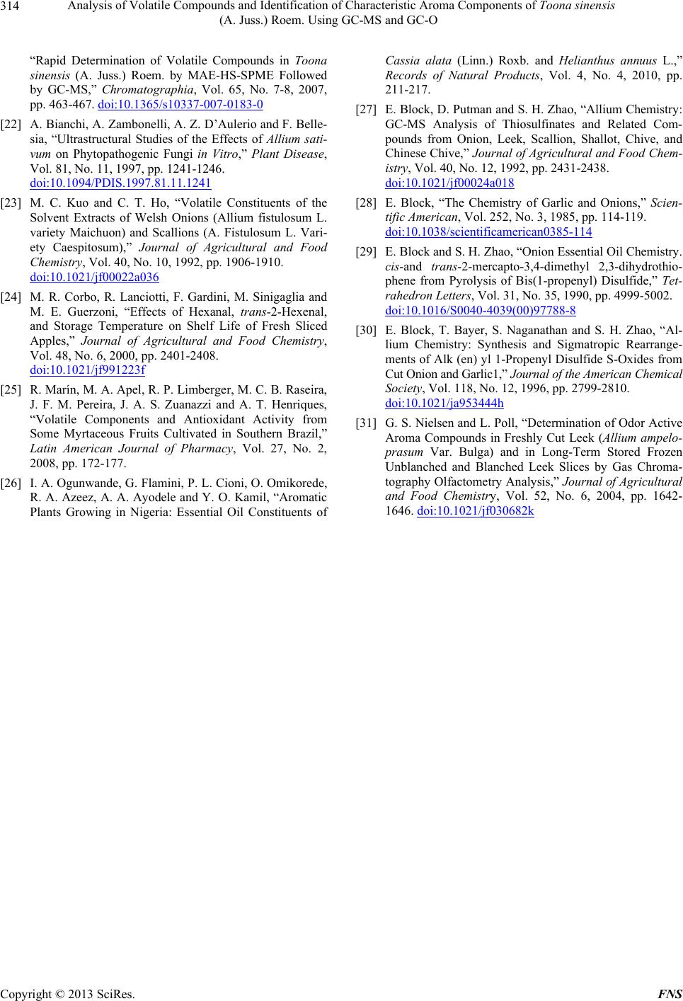 Analysis of Volatile Compounds and Identification of Characteristic Aroma Components of Toona sinensis (A. Juss.) Roem. Using GC-MS and GC-O Copyright © 2013 SciRes. FNS 314 “Rapid Determination of Volatile Compounds in Toona sinensis (A. Juss.) Roem. by MAE-HS-SPME Followed by GC-MS,” Chromatographia, Vol. 65, No. 7-8, 2007, pp. 463-467. doi:10.1365/s10337-007-0183-0 [22] A. Bianchi, A. Zambonelli, A. Z. D’Aulerio and F. Belle- sia, “Ultrastructural Studies of the Effects of Allium sati- vum on Phytopathogenic Fungi in Vitro,” Plant Disease, Vol. 81, No. 11, 1997, pp. 1241-1246. doi:10.1094/PDIS.1997.81.11.1241 [23] M. C. Kuo and C. T. Ho, “Volatile Constituents of the Solvent Extracts of Welsh Onions (Allium fistulosum L. variety Maichuon) and Scallions (A. Fistulosum L. Vari- ety Caespitosum),” Journal of Agricultural and Food Chemistry, Vol. 40, No. 10, 1992, pp. 1906-1910. doi:10.1021/jf00022a036 [24] M. R. Corbo, R. Lanciotti, F. Gardini, M. Sinigaglia and M. E. Guerzoni, “Effects of Hexanal, trans-2-Hexenal, and Storage Temperature on Shelf Life of Fresh Sliced Apples,” Journal of Agricultural and Food Chemistry, Vol. 48, No. 6, 2000, pp. 2401-2408. doi:10.1021/jf991223f [25] R. Marín, M. A. Apel, R. P. Limberger, M. C. B. Raseira, J. F. M. Pereira, J. A. S. Zuanazzi and A. T. Henriques, “Volatile Components and Antioxidant Activity from Some Myrtaceous Fruits Cultivated in Southern Brazil,” Latin American Journal of Pharmacy, Vol. 27, No. 2, 2008, pp. 172-177. [26] I. A. Ogunwande, G. Flamini, P. L. Cioni, O. Omikorede, R. A. Azeez, A. A. Ayodele and Y. O. Kamil, “Aromatic Plants Growing in Nigeria: Essential Oil Constituents of Cassia alata (Linn.) Roxb. and Helianthus annuus L.,” Records of Natural Products, Vol. 4, No. 4, 2010, pp. 211-217. [27] E. Block, D. Putman and S. H. Zhao, “Allium Chemistry: GC-MS Analysis of Thiosulfinates and Related Com- pounds from Onion, Leek, Scallion, Shallot, Chive, and Chinese Chive,” Journal of Agricultural and Food Chem- istry, Vol. 40, No. 12, 1992, pp. 2431-2438. doi:10.1021/jf00024a018 [28] E. Block, “The Chemistry of Garlic and Onions,” Scien- tific American, Vol. 252, No. 3, 1985, pp. 114-119. doi:10.1038/scientificamerican0385-114 [29] E. Block and S. H. Zhao, “Onion Essential Oil Chemistry. cis-and trans-2-mercapto-3,4-dimethyl 2,3-dihydrothio- phene from Pyrolysis of Bis(1-propenyl) Disulfide,” Tet- rahedron Letters, Vol. 31, No. 35, 1990, pp. 4999-5002. doi:10.1016/S0040-4039(00)97788-8 [30] E. Block, T. Bayer, S. Naganathan and S. H. Zhao, “Al- lium Chemistry: Synthesis and Sigmatropic Rearrange- ments of Alk (en) yl 1-Propenyl Disulfide S-Oxides from Cut Onion and Garlic1,” Journal of the American Chemical Society, Vol. 118, No. 12, 1996, pp. 2799-2810. doi:10.1021/ja953444h [31] G. S. Nielsen and L. Poll, “Determination of Odor Active Aroma Compounds in Freshly Cut Leek (Allium ampelo- prasum Var. Bulga) and in Long-Term Stored Frozen Unblanched and Blanched Leek Slices by Gas Chroma- tography Olfactometry Analysis,” Journal of Agricultural and Food Chemistry, Vol. 52, No. 6, 2004, pp. 1642- 1646. doi:10.1021/jf030682k