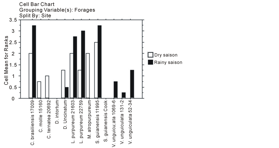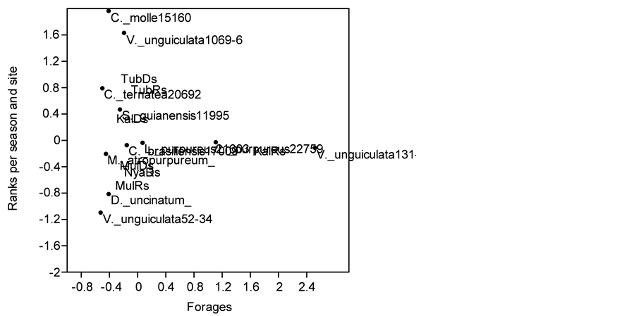Choice of D. uncinatum, C. brasiliensis and L. purpureus 21603 were more obvious in Mulungu, Nyangezi in the rainy season and Mulungu in the dry season. On the other side, S. guianensis 11995 was chosen in Tubimbi- mostly in the rainy season, in Kamanyola and Tubimbi mainly in dry season, less L. purpureus 22759 and V. unguiculata 131-2 in Nyangezi in the dry season and in Kamanyola in the rainy season. On the other side, S.