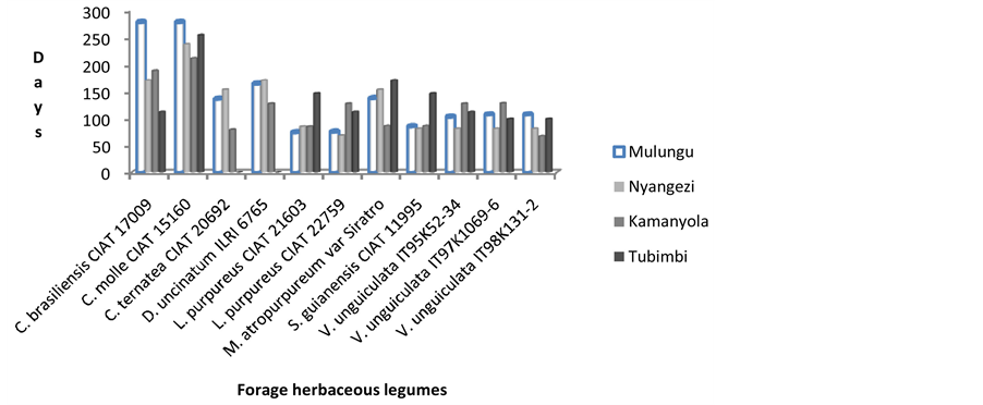 Fodders fast flowering in the highlands with rich soils (Mulungu) are; L. purpureus 21603, L. purpureus 22759, S. guianensis 11995, V. unguiculata 52-34. In the highlands with poor soils (Nyangezi) it was S. guianensis 11995, V. unguiculata 52-34, V. unguiculata 131-2, V. unguiculata 1069-6, L. purpureus 22759 and L. purpureus 21603 and in the midlands with rich soils are in Kamanyola C. ternatea, L. purpureus 21603, V. unguiculata 131-2, M. atropurpureum and S. guianensis 11995 and in the midlands with poor soils in Tubimbi are V. unguiculata 1069-6 and V.unguiculata 131-2.