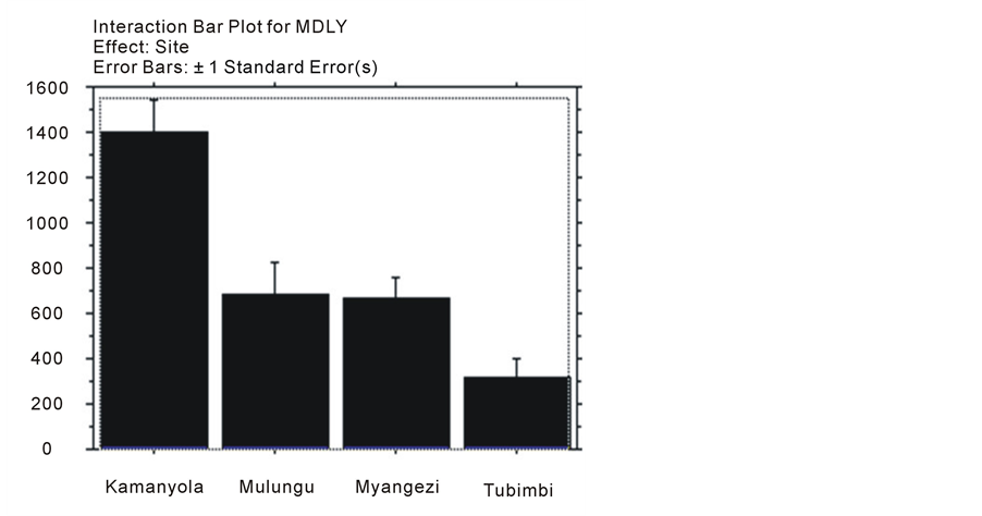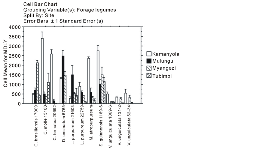 There were significant differences in the MDLY (kg/ha) of forage in the sites (P < 0.5) respectively in Mulungu, Nyangezi and Tubimbi except in Kamanyola without significant difference (P > 0.5), see figure 2. The best forages in terms of yield were; in Mulungu D. uncinatum, L. purpureus 21603, S. guianensis, in Nyangezi C. brasiliensis, D. uncinatum, S. guianensis, in Kamanyola C. molle, C. ternatea, M. atropurpureum, S. guianensis, L. purpureus 22759 and in Tubimbi S. guianensis and C. molle.