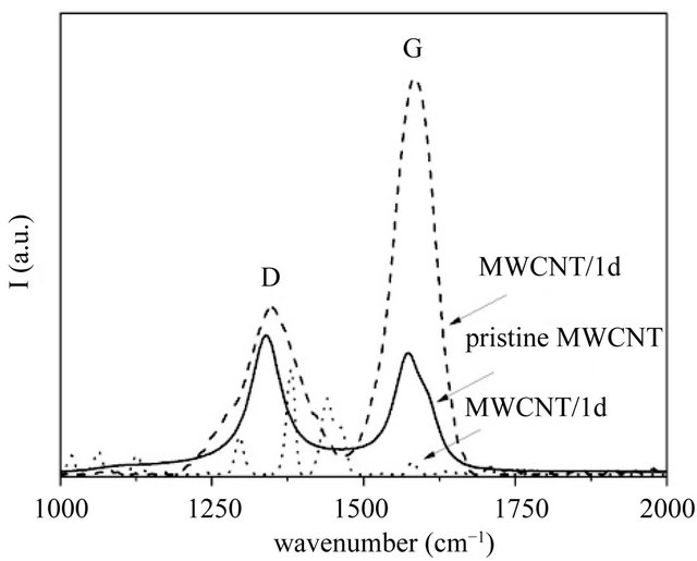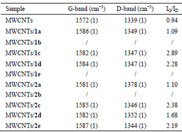 Table 1. Wavenumber of the Raman bands and scattering intensities ratio (IG/ID) of pristine and functionalized MWCNTs.