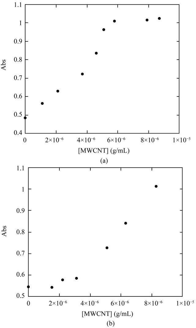 Figure 5. Trend of the absorbance of the hybrid with the phosphate ester (a) 1c, (b) 1e as function of MWCNT concentration (from 0 to 8 × 10−6 g/mL).