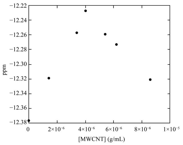 Figure 7. 31P chemical shift of the hybrid with the phosphate ester 1a (1 × 10−4 M) vs. MWCNT concentration (from 0 to 8 × 10−6 g/mL).