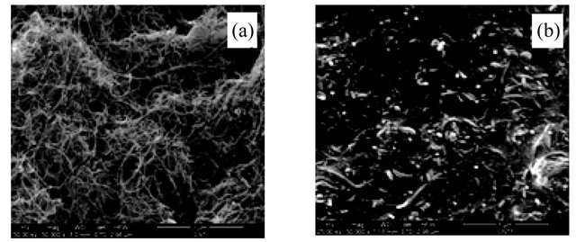 Figure 9. SEM micrographs of (a) pristine MWCNTs, (b) hybrid with the phosphate ester 1c.