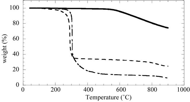 Figure 10. Curves of mass loss to temperature (TG) for MWCNTs (───), phosphate ester 1c (─ ─── ─) and hybrid with phosphate ester 1c (─ ─ ─).