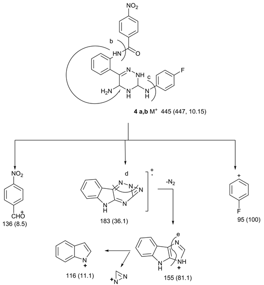 Compounds 5b, 6b exhibited δ at 24 ppm for CH3O carbons. Mass fragmentation patterns of compound 4 showed that a molecular ion peak with a base peak at m/z 95 attribute to 4-fluorophenyl fragment (Figure 2).