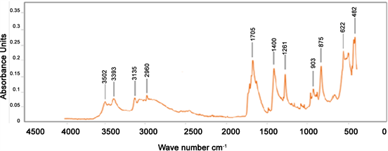 The FTIR spectrum of 1 (Figure 1) exhibits a weak absorption band centered at 3502 cm−1 attributed to νN−H of piperidinium cations. The sharp bands observed at 3393 cm−1 and 3135 cm−1 can be assigned to the well-known νO-H vibrations of the H2O molecules of crystallization involved in hydrogen bonding and the H2O ligands that are coordinated to the CrIII sites respectively [24] [25]. The stretching vibration band of C-H (νC-H) is situated at 2960 cm−1. The strong band appearing at 1705 cm−1 corresponds to νC=O [26] and the medium-size band at 1400 cm−1 can be assigned to the symmetric stretching absorption of the carboxylate groups of the oxalato ligand [26]. Strong to medium well-resolved bands appear at 1261 cm−1 (νC−N), 1181 cm−1 (νC−O), 1081 cm−1 (νC−C) [27] [28]. The pattern of the δO-C=O vibrations range of 944 - 875 cm−1 supports the presence of chelating oxalate dianions in the structure of 1. Medium to weak bands observed in the region 622 - 482 cm−1 may be attributed to vibrations νCr−O within the coordination spheres around the metallic centers ions. These results are consistent with the presence of cation, [Cr(C2O4)2(H2O)2]− complex anion, and H2O molecules of crystallization in 1.