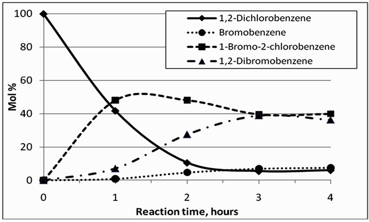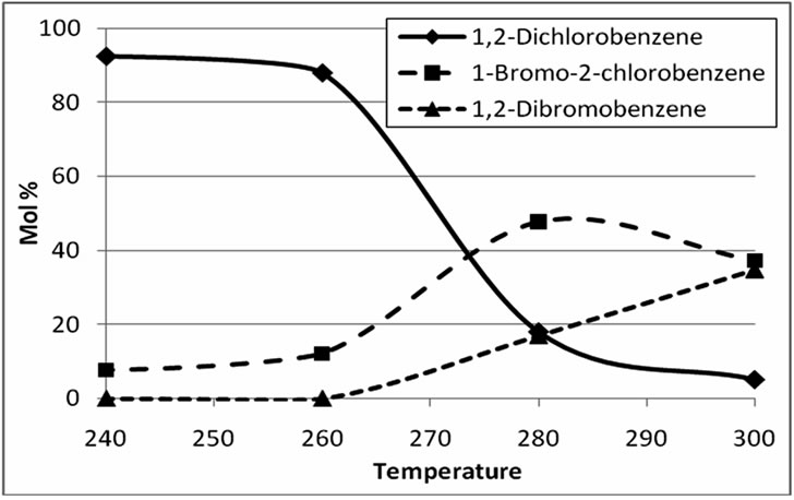 Figure 4. Concentrations of 1,2-dichlorobenzene, 1-bromo- 2-chlorobenzene, and 1,2-dibromobenzene as a function of exchange temperatures between 240˚C and 300˚C. Exchange time, 4 h.