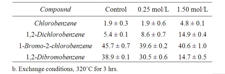 Analyte concentrations were determined by gas chromatography using a Varian CP 3800 gas chromatograph equipped with flame ionization detector, split-splitless injector, and a 25 m × 0.53 mm × 1.0 µm OV-17 column. The initial hold was 60˚C for 3 min, followed by a 10˚C /min ramp and a final hold at 250˚C for 10 min. The internal standard selected for bromobenzene, chlorobenzene and dichlorobenzene isomers was ortho-xylene, that for all possible bromochlorobenzene and dibromobenzene isomers was 1,2,4,5-tetramethylbenzene. Concentrations were determined based on five point, forced zero-intercept calibrations that included all possible dichloro-, bromochloroand dibromobenzene isomers. All calibrations and sample dilutions were carried out using MTBE as solvent. Concentrations are expressed as mol% relative to DCB initially present (set to 100%). Within the reported temperature regime, no evidence was found for significant mineralization or the formation of semivotatiles other than those included in this study. Consequently, the mol% sum of all aromatics present during and after the reported exchange experiments was found to be essentially invariant.