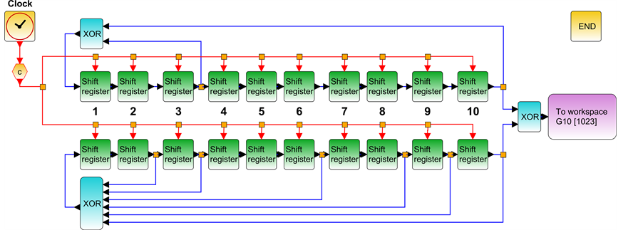 In the same way, the MSRG register for the Q-Channel can be design. Its block diagram in Figure 3 is implemented in Scilab/Xcos and represented in Figure 4.